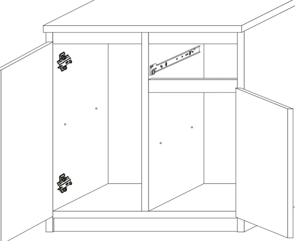 - Komoda wyposażona jest w przestronną szufladę, która porusza się na prowadnicach rolkowych, zapewniając płynne i ciche otwieranie.