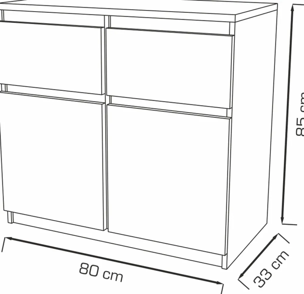 - Nowoczesna komoda MONTEGO o szerokości 80 cm to mały, ale bardzo praktyczny mebel. Wyposażony został w dwie szuflady, które poruszają się na niezawodnych prowadnicach rolkowych. Nowoczesna komoda posiada również dwie pojemne szafki.