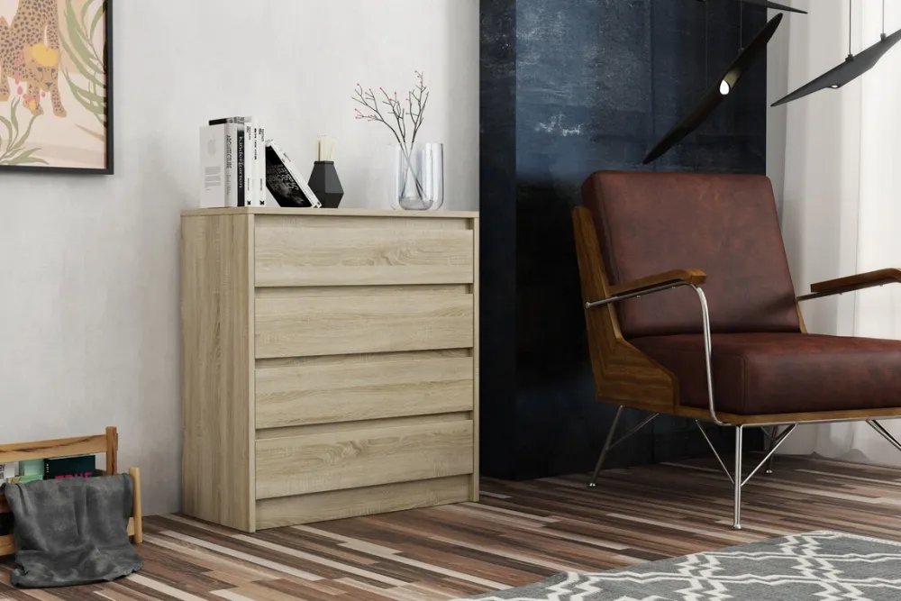 - Komoda wyposażona jest w cztery praktyczne szuflady, która porusza się na prowadnicach rolkowych, zapewniając płynne i ciche otwieranie.