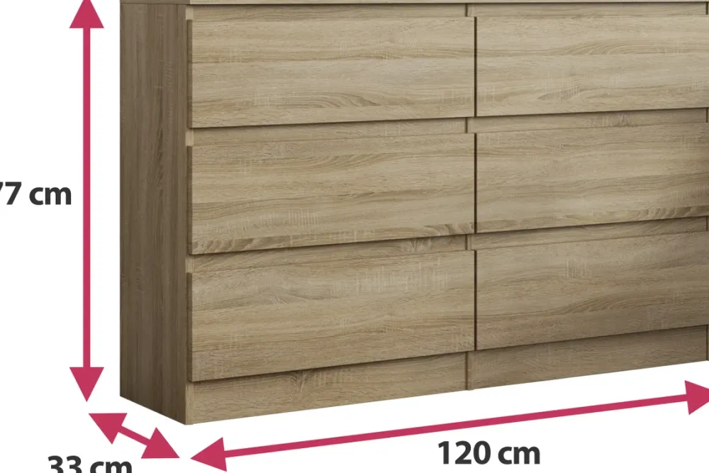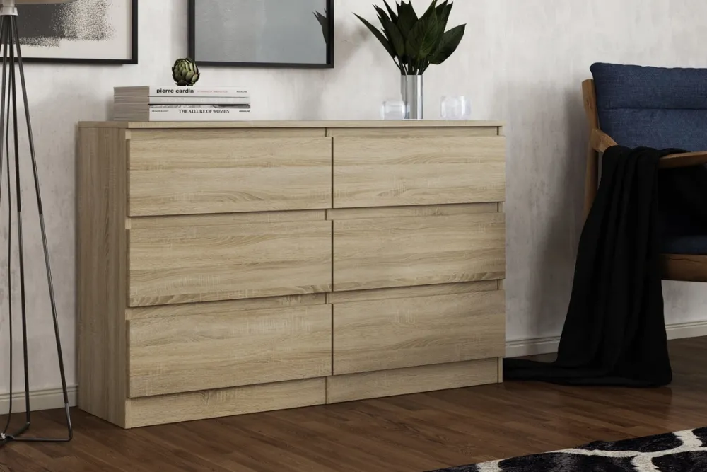 - Komoda wyposażona jest w sześć szuflad, które poruszają się na prowadnicach rolkowych, co zapewnia płynne i ciche wysuwanie.