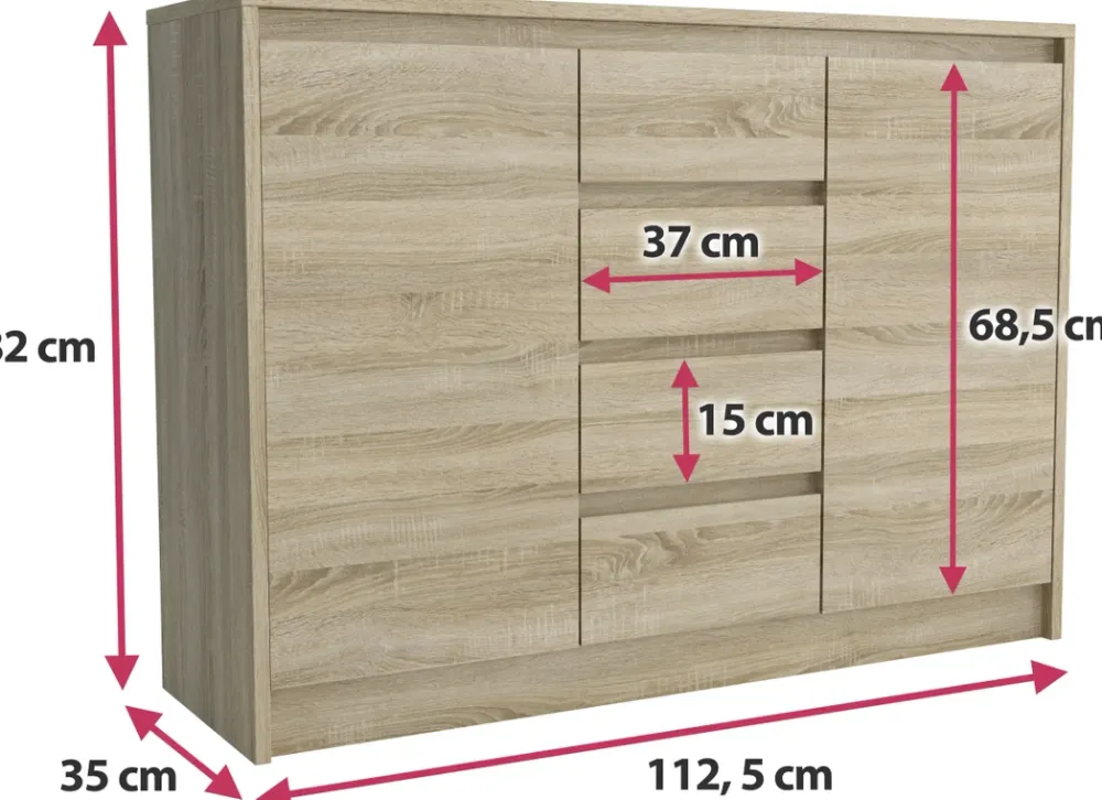Praktyczne cztery szuflady, które poruszają się na prowadnicach rolkowych, zapewniają wygodne i płynne otwieranie, umożliwiając łatwy dostęp do przechowywanych rzeczy. Dwoje drzwi skrywa pojemną przestrzeń, idealną do przechowywania większych przedmiotów, takich jak tekstylia, dokumenty czy inne niezbędne akcesoria. Taki układ gwarantuje, że Twoje rzeczy będą zawsze w porządku, a dom zyska dodatkową przestrzeń do przechowywania.