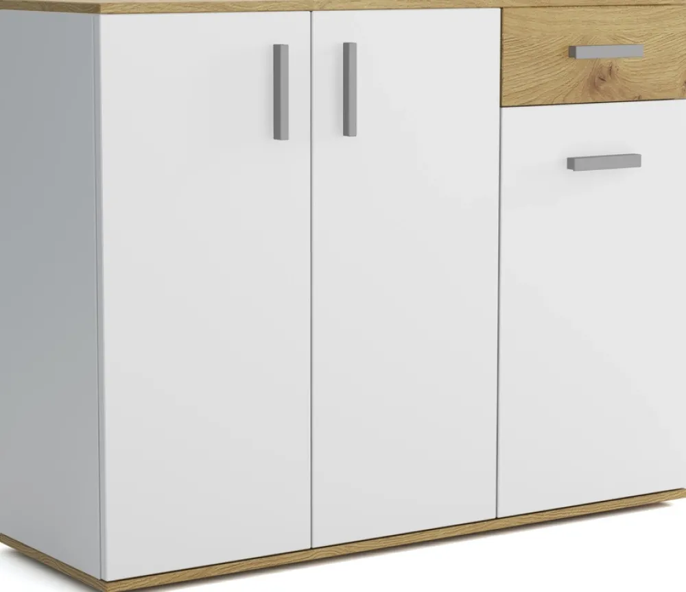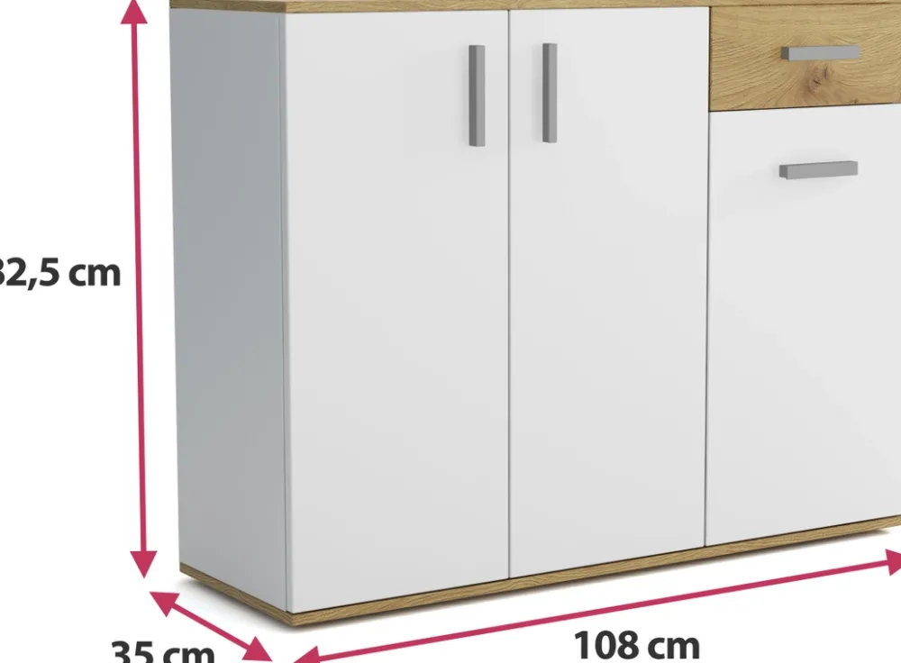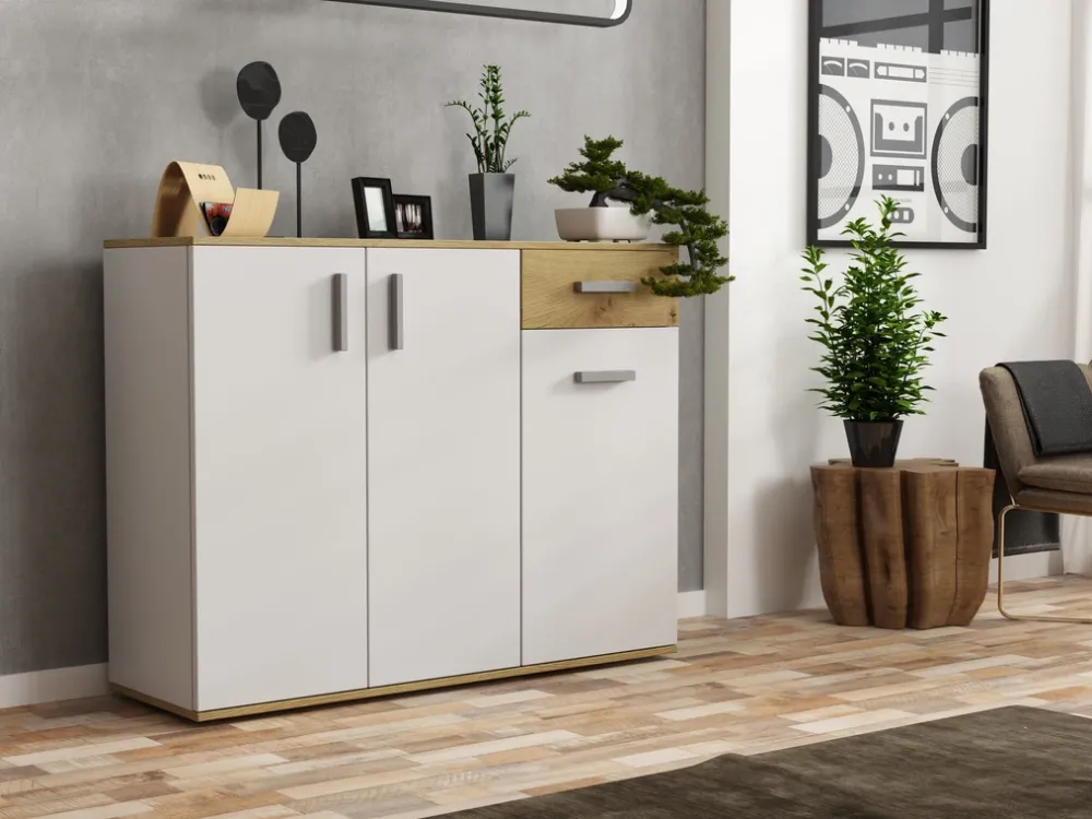 - Trzydrzwiowa komoda do przedpokoju JOVITA zapewni Ci dużą ilość miejsca do przechowywania dzięki przestronnym półkom, które znajdują się za każdymi z drzwi komody. Dodatkowo komoda posiada praktyczną szufladę, idealną na drobniejsze akcesoria.