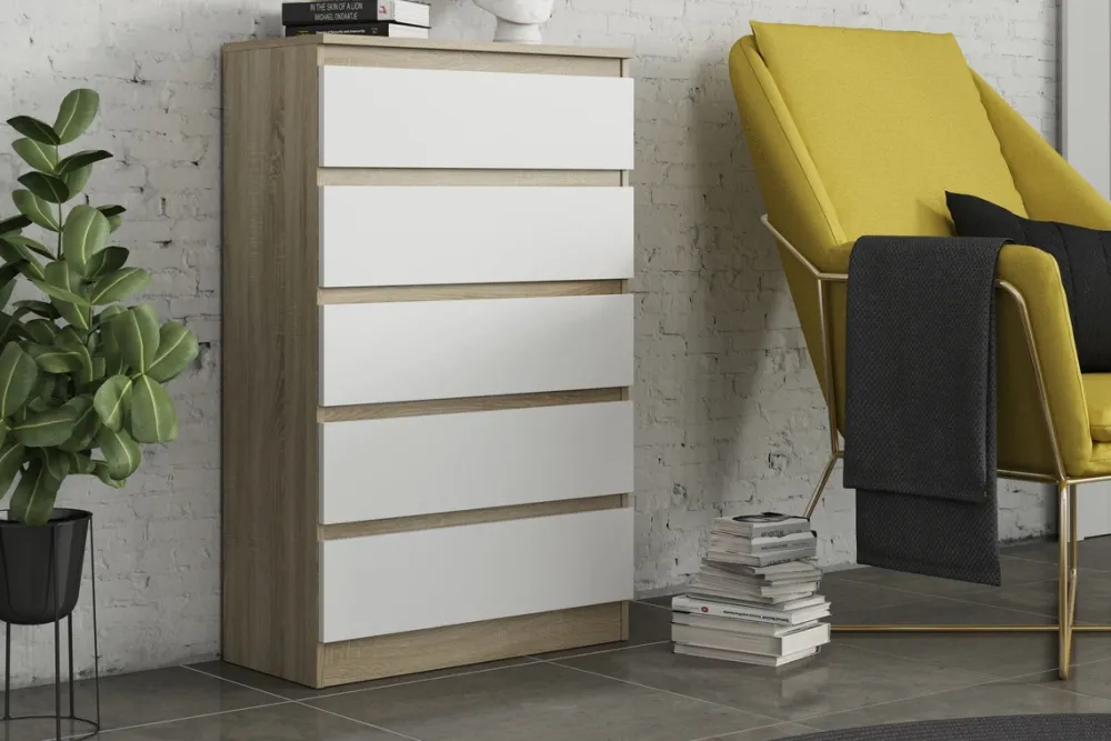 Komoda wyposażona jest w pięć pojemnych szuflad, które poruszają się płynnie na prowadnicach rolkowych. Dzięki temu codzienne korzystanie z komody jest wygodne i ciche. Szuflady będą idealnym miejscem na przechowywanie ubrań, dokumentów czy innych domowych akcesoriów, pomagając utrzymać porządek w przestrzeni.