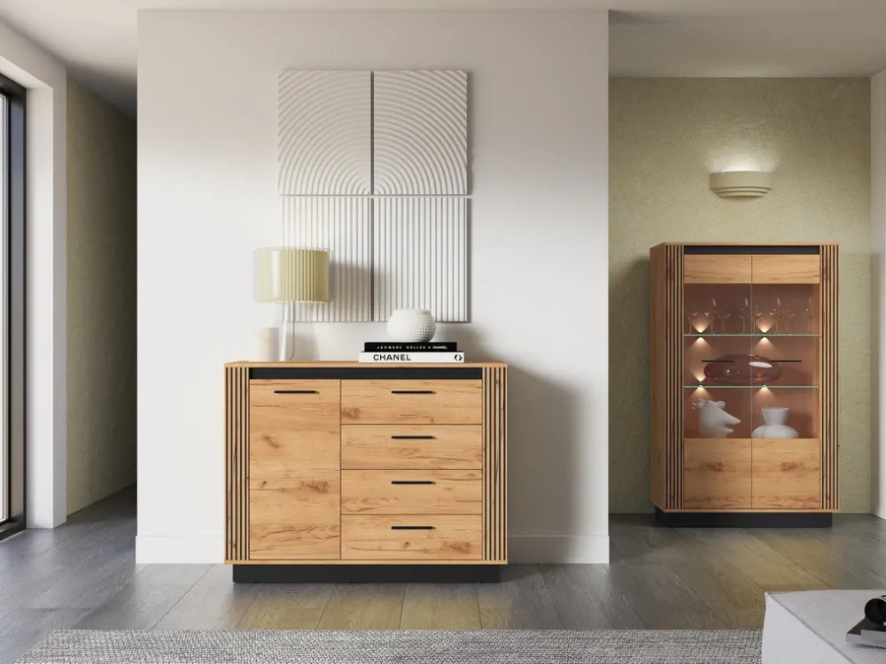 Komoda pięknie prezentuje się solo, ale możesz ją także zestawić z witryną z tej samej kolekcji, tworząc spójną i elegancką aranżację. Jeśli szukasz mebla, który łączy styl z praktycznością, to właśnie go znalazłeś!