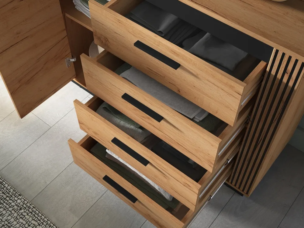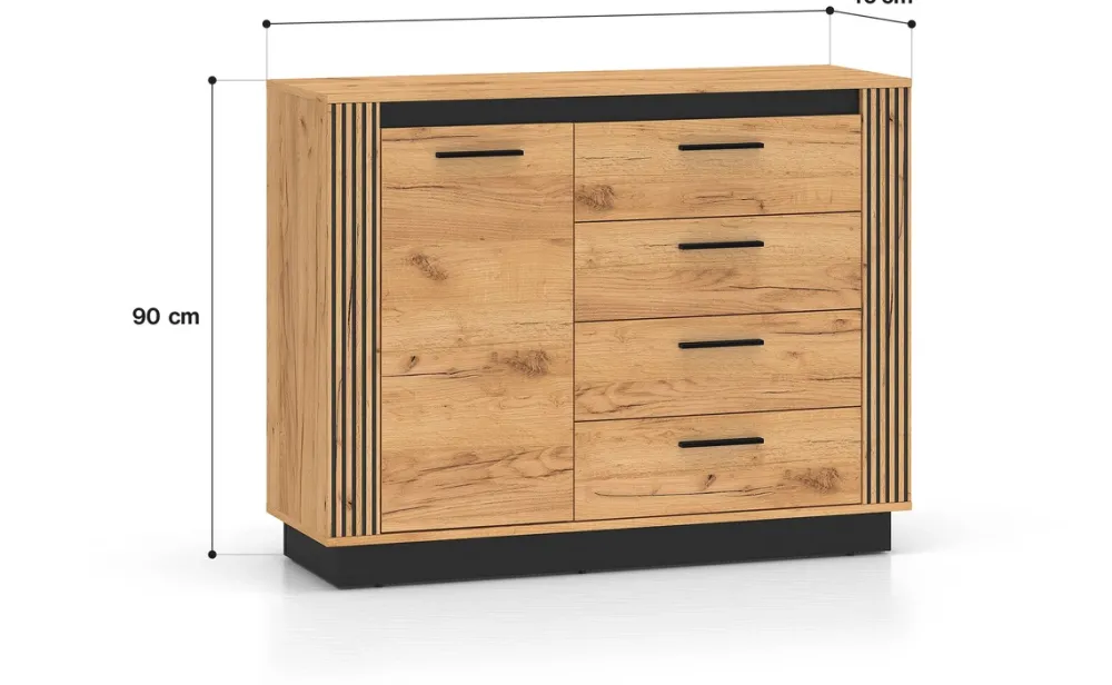Kompaktowa komoda o szerokości 115 cm to idealne połączenie funkcjonalności i nowoczesnego designu. Jej harmonijna kolorystyka – ciepły dąb craft złoty i głęboka czerń – sprawdzi się zarówno w salonie, sypialni, jak i domowym biurze. Mebel oferuje aż cztery pojemne szuflady oraz jedną szafkę z półką, zapewniając mnóstwo miejsca na ubrania, dokumenty lub inne drobiazgi.