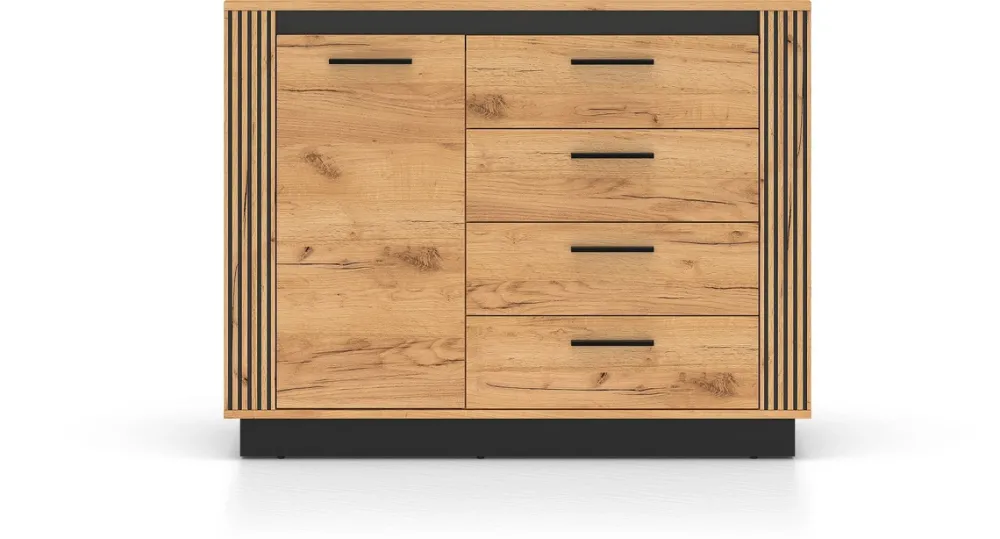 - Nowoczesna kompaktowa komoda loftowa o szerokości 115 cm z lamelami i czarnymi detalami. Wyposażona w 4 szuflady i jedną szafkę z półką. Cichy domyk, obrzeża ABS, płyta laminowana, oświetlenie LED (opcjonalnie). Kolor dąb złoty craft z czarnymi wstawkami.