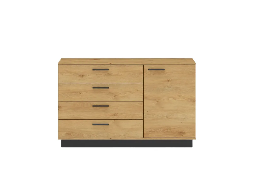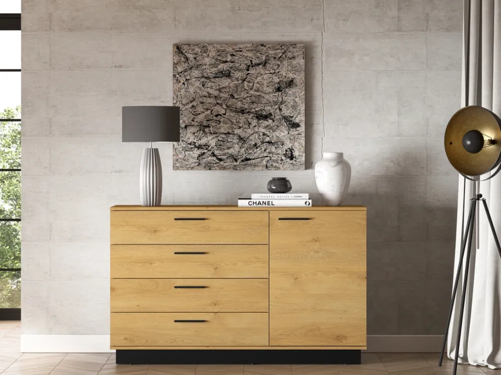 - Komoda MONELLI 138 cm w kolorze dąb stylowy to elegancki mebel z czterema szufladami, drzwiami i półkami. Dzięki pełnemu wysuwowi, cichym zawiasom i kompaktowej formie świetnie sprawdzi się w salonie, sypialni lub przedpokoju.