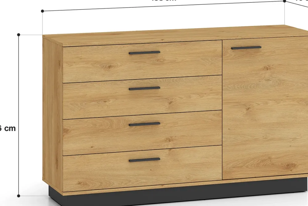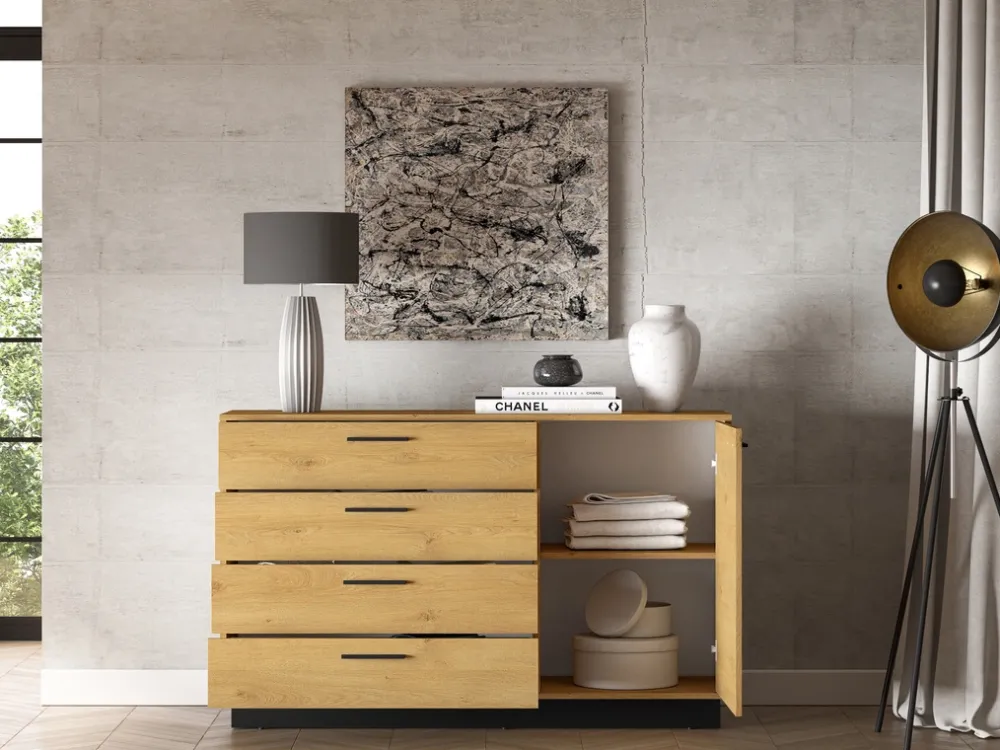 Zastanawiasz się, czy komoda MONELLI pomieści wszystkie Twoje rzeczy? Dzięki przemyślanej konstrukcji z jednymi drzwiami, czterema szufladami i dwiema półkami z łatwością zapanujesz nad domowym chaosem. Doskonale sprawdzi się w salonie, sypialni czy nawet w przedpokoju jako pomocniczy mebel do przechowywania.