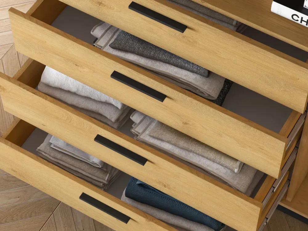 - Praktyczne szuflady – cztery głębokie szuflady idealne na dokumenty, tekstylia lub drobiazgi