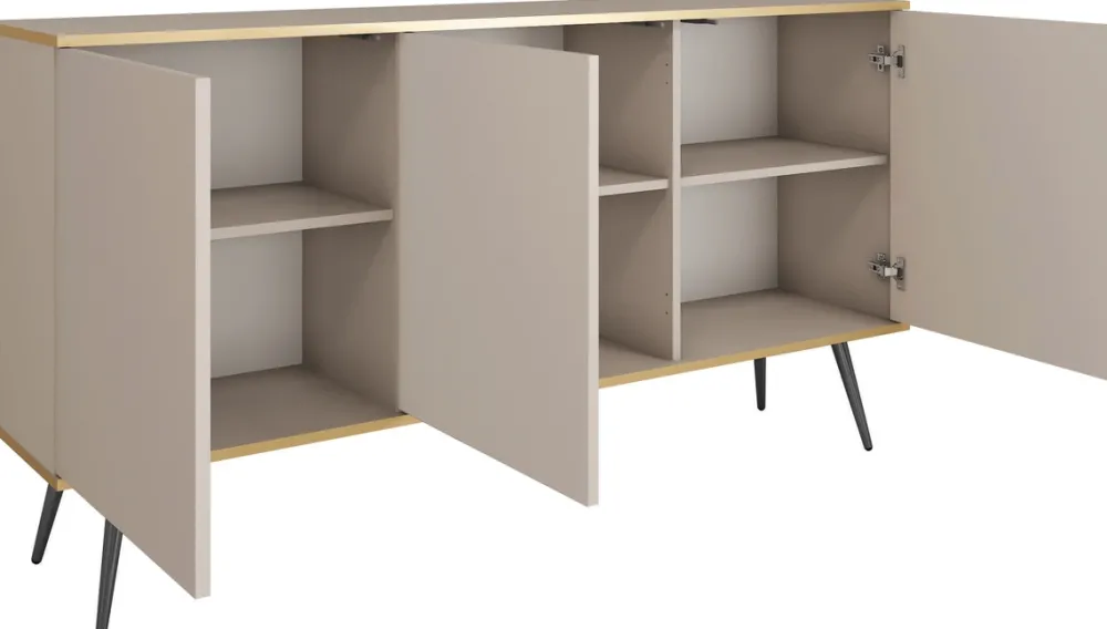 - Komoda trzydrzwiowa 160 cm ORVIETO charakteryzuje się swoimi wysokimi nóżkami, które wykonano z metalu. Komoda posiada trzy drzwi z mechanizmem otwierania push to open. Za każdymi drzwiami znajdują się dwie półki na ubrania lub akcesoria.