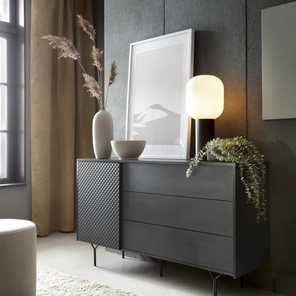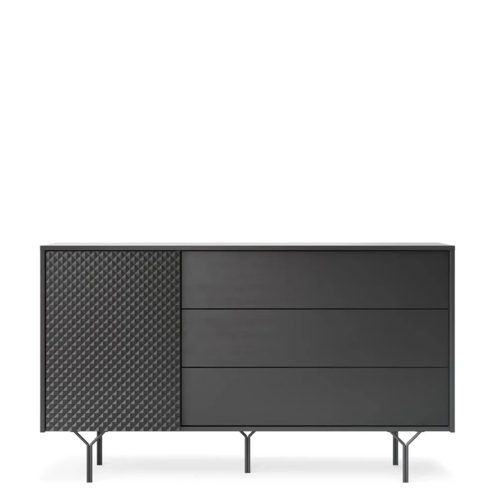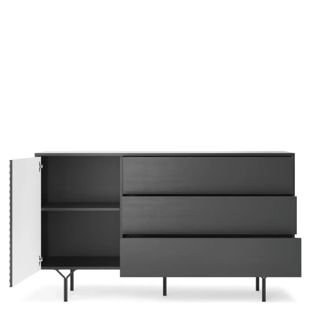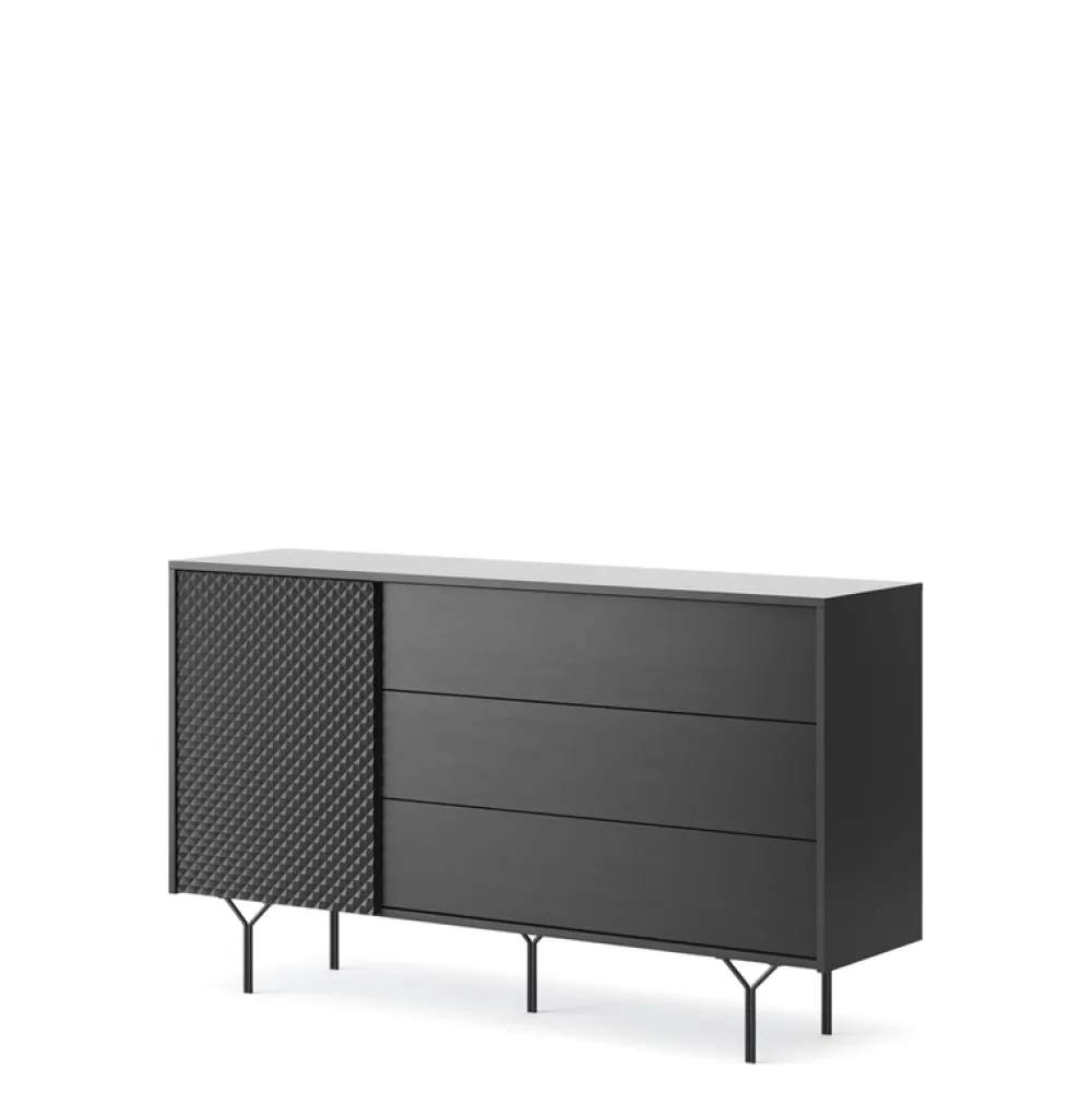 Zaprojektowana z myślą o przechowywaniu, ta nowoczesna komoda posiada drzwi, które skrywają półkę oraz trzy przestronne szuflady, które pomieszczą wszystkie niezbędne przedmioty. Dzięki swojej szerokości komoda idealnie wpasuje się w większe przestrzenie, stając się zarazem praktycznym i dekoracyjnym elementem aranżacji i doda jej szyku.