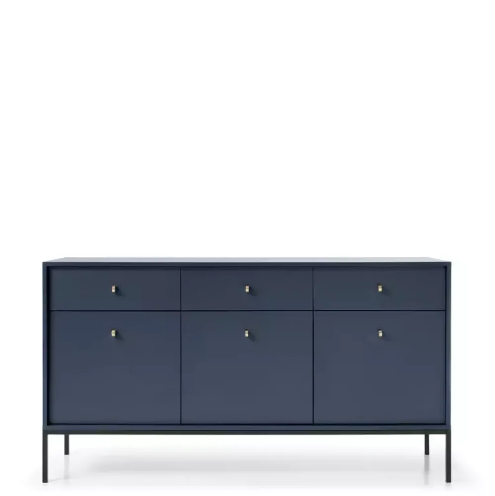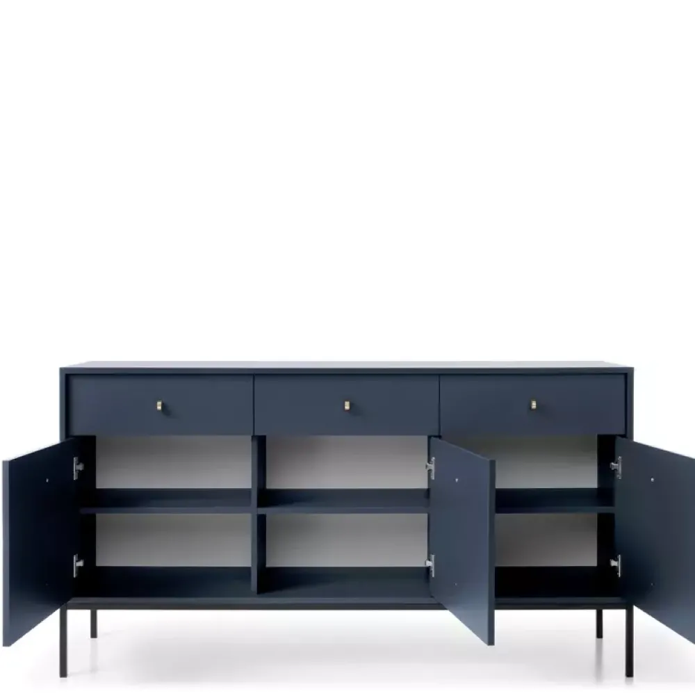 - Niezwykle stylowa i praktyczna komoda MONTI w kolorze granatowym, osadzona na czarnych metalowych nogach. Nowoczesny design, trzy szuflady i drzwi oferują przestrzeń i elegancję. Idealna dla nowoczesnego salonu.