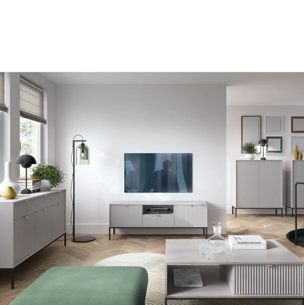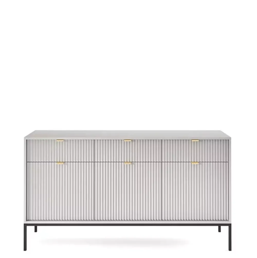 Szara komoda AVANTI o szerokości 154 cm posiada trzy szuflady i sześć niezależnych wnęk, w których znajdziesz dużo miejsca do przechowywania. Ryflowane fronty z pewnością przyciągną oko odwiedzających Twój dom gości, a złote uchwyty zapewnią Ci wygodny dostęp do wnętrza komody. Konstrukcję osadzono na metalowych nóżkach malowanych proszkowo na czarno. Taka podpora zapewni stabilność mebla.