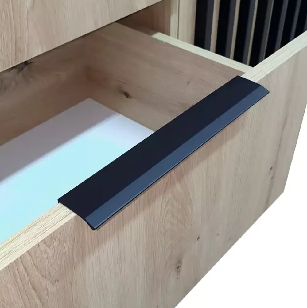 Komoda z lamelami z kolekcji KELLY wpasuje się w nowoczesne aranżacje, gdzie nie dość, że będzie ozdobą wnętrza, zapewni dużo miejsca do przechowywania. Komoda ma 105 cm szerokości i podzielono ją na dwie części. Po lewej stronie znajdują się trzy pojemne szuflady, a po prawej stronie jedna półka, która daje dwie wnęki do przechowywania. Czarne lamele nadają tej nowoczesnej komodzie ponadczasowego charakteru.