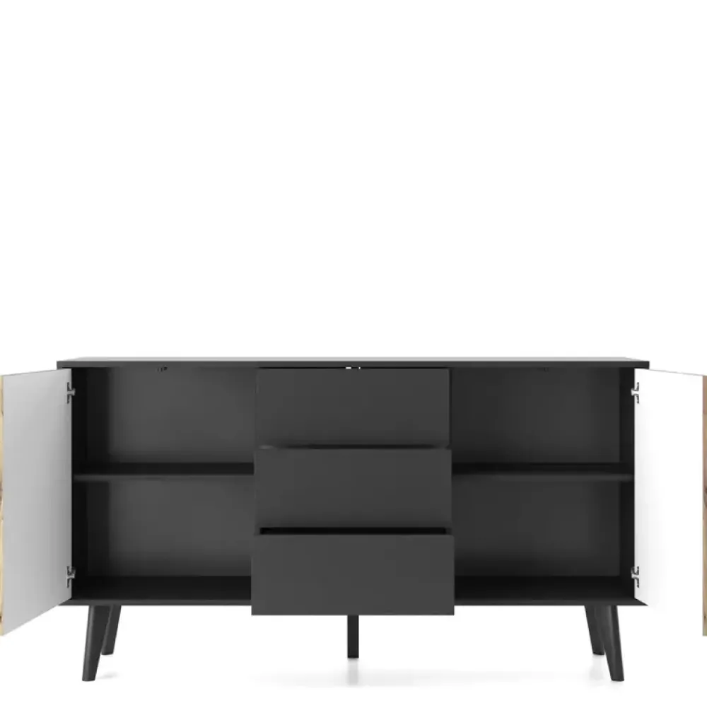 - Duża komoda VITERBO do salonu w modnym i nowoczesnym stylu z trzema szufladami i dwoma drzwiami. Komoda jest na czarnych drewniano-bukowych nogach. Ma ona 154 cm szerokości, a drzwi i szuflady otwierają się w systemie push to open.