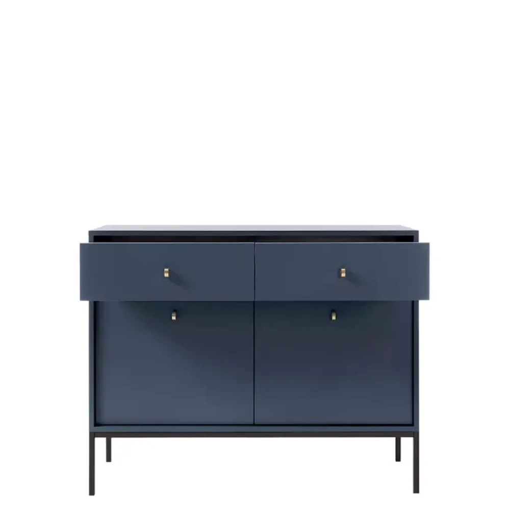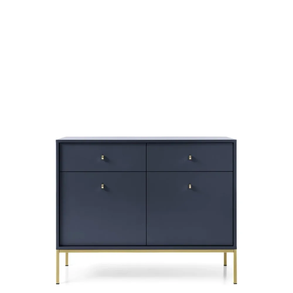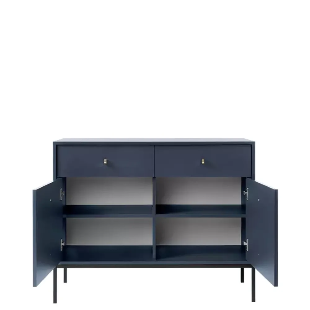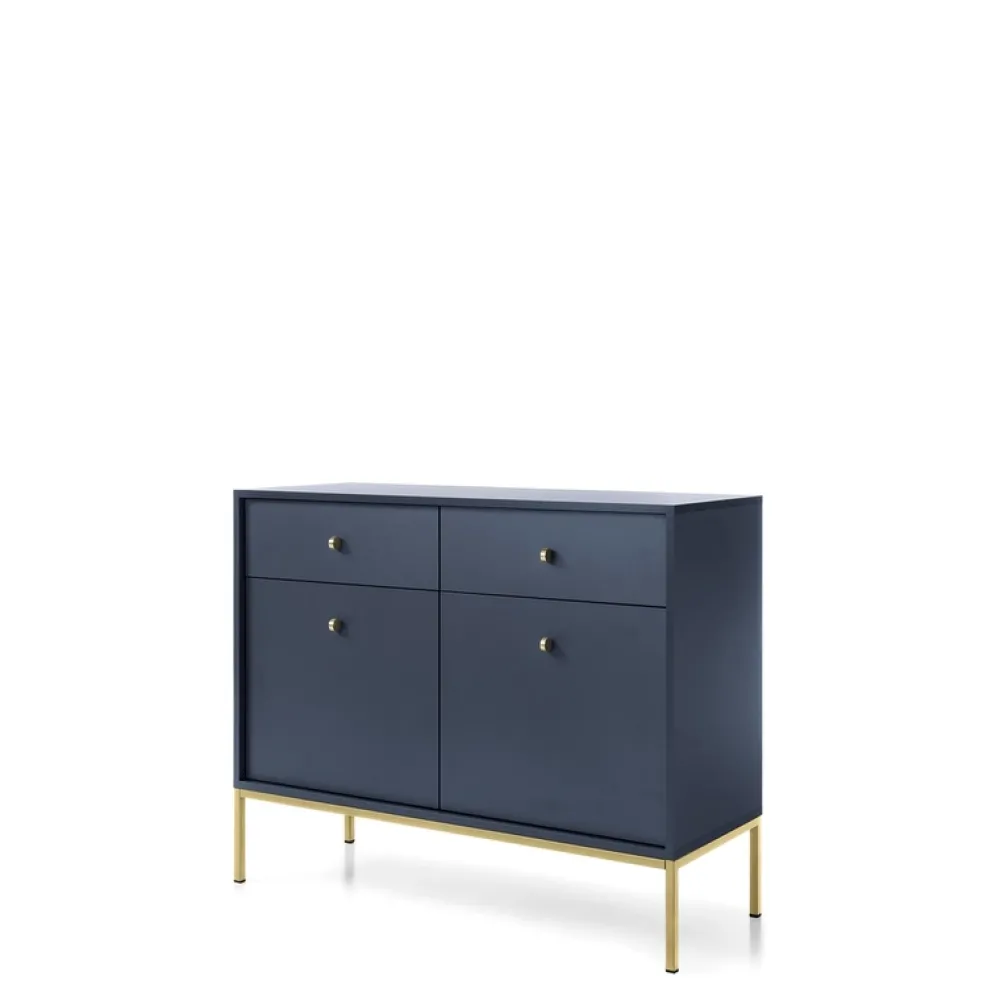 - Podkreśl swój gust z naszą granatową komodą MONTI. Nowoczesny design łączy elegancję z funkcjonalnością, oferując dwoje drzwi i dwie szuflady. Złote metalowe nogi dodają szczyptę luksusu. Idealne uzupełnienie każdego salonu, które przyciąga spojrzenia.