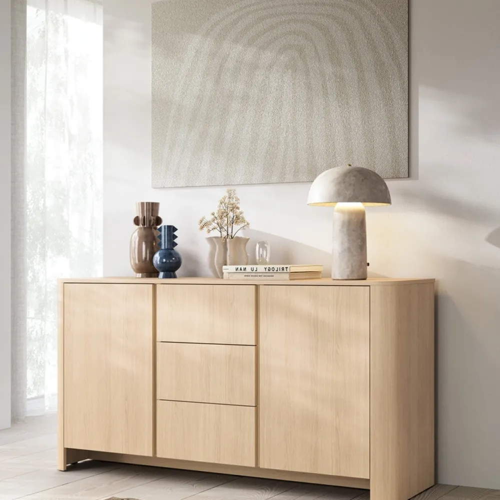 Komoda dąb Vicenza BELVI to doskonałe połączenie nowoczesnej formy z ciepłem naturalnego dekoru. Jej wybarwienie inspirowane szlachetnym drewnem dębowym wnosi do wnętrza przytulność i ponadczasową elegancję. Dzięki trzem szufladom i dwóm pojemnym szafkom z półkami z łatwością zorganizujesz przestrzeń w salonie, sypialni lub jadalni, nie rezygnując z estetyki.
