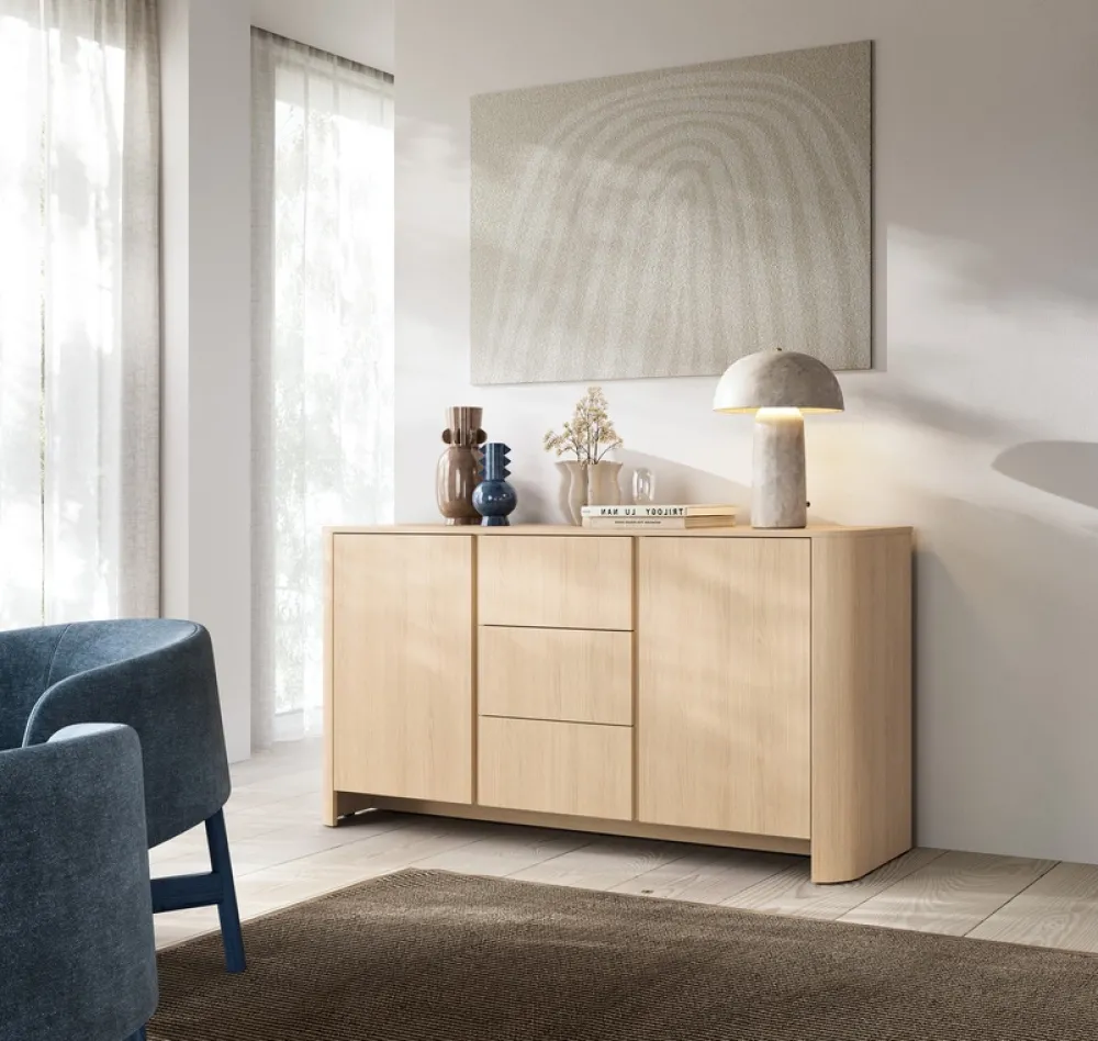 Nowoczesna komoda BELVI w kolorze dąb Vicenza to funkcjonalny mebel, który sprawdzi się zarówno jako element zabudowy w salonie, jak i praktyczna szafka w sypialni. Bezuchwytowy system otwierania dodaje całości lekkości, a subtelne linie i złote akcenty tworzą spójną, elegancką całość. To idealne rozwiązanie dla tych, którzy cenią porządek, estetykę i naturalne materiały.