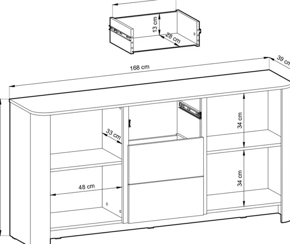 - Komoda dąb Vicenza BELVI: szer. 168 cm, gł. 39 cm, wys. 84 cm. Wykonana z płyty laminowanej 16 mm, z wykończeniem ABS. Posiada 3 szuflady i 2 szafki z półkami. System push-open bez uchwytów. Kolor dąb Vicenza, odporny na uszkodzenia. Idealna do salonu.