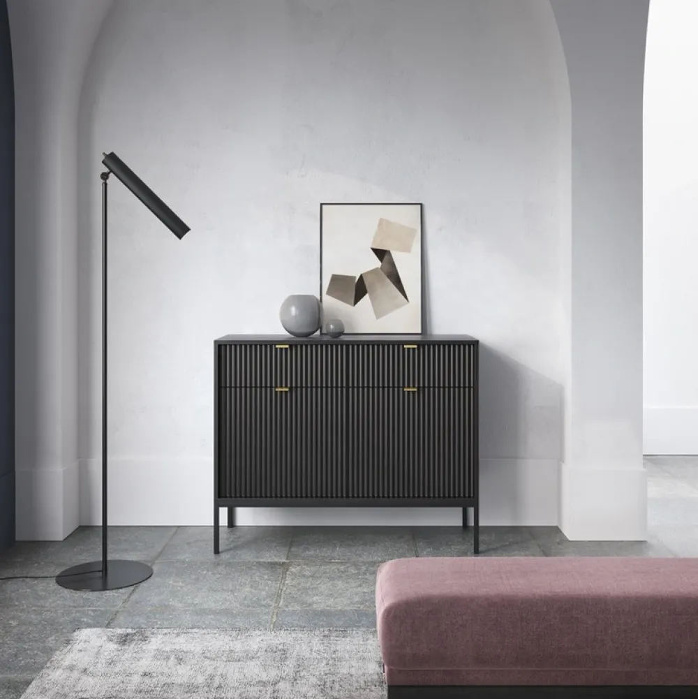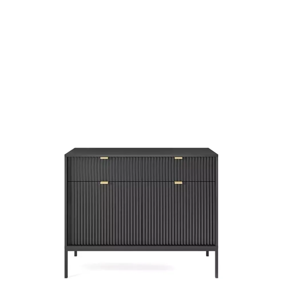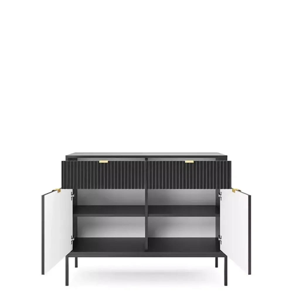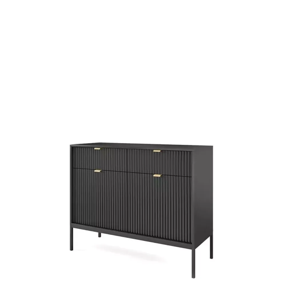 Czarna komoda AVANTI o szerokości 104 cm posiada dwie szuflady i cztery niezależne wnęki, w których znajdziesz dużo miejsca do przechowywania. Ryflowane fronty z pewnością przyciągną oko odwiedzających Twój dom gości, a złote uchwyty zapewnią Ci wygodny dostęp do wnętrza komody. Konstrukcję osadzono na metalowych nóżkach malowanych proszkowo na czarno. Taka podpora zapewni stabilność mebla.