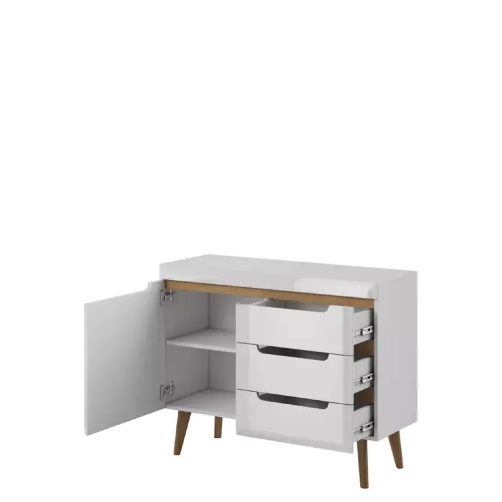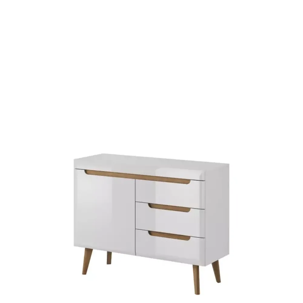 Komoda z szufladami została wyposażona w trzy szuflady po prawej stronie i jedną półkę po lewej. Fronty wykończone na wysoki połysk w połączeniu z drewnopodobnymi wstawkami wprowadzą do wnętrza przytulny klimat.