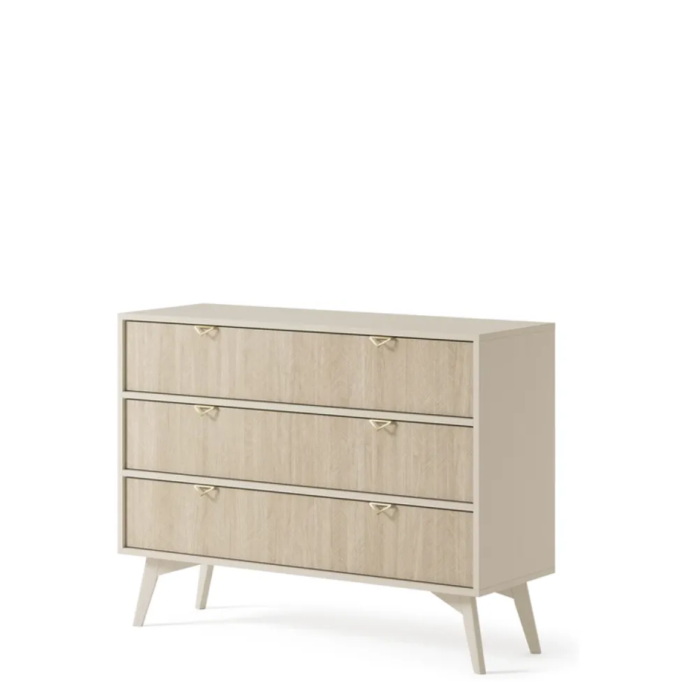 Stabilność i elegancję zapewniają wysokie drewniane nóżki, które wykonane zostały w kolorze beżu piaskowego, podobnie jak korpus oraz wnętrze mebla. Stanowi to doskonałe tło dla wzoru jodełki scandi, który zdobi fronty komody, nadając jej unikalnego charakteru. Wzór ten dodatkowo jest bardzo modny w tym sezonie.