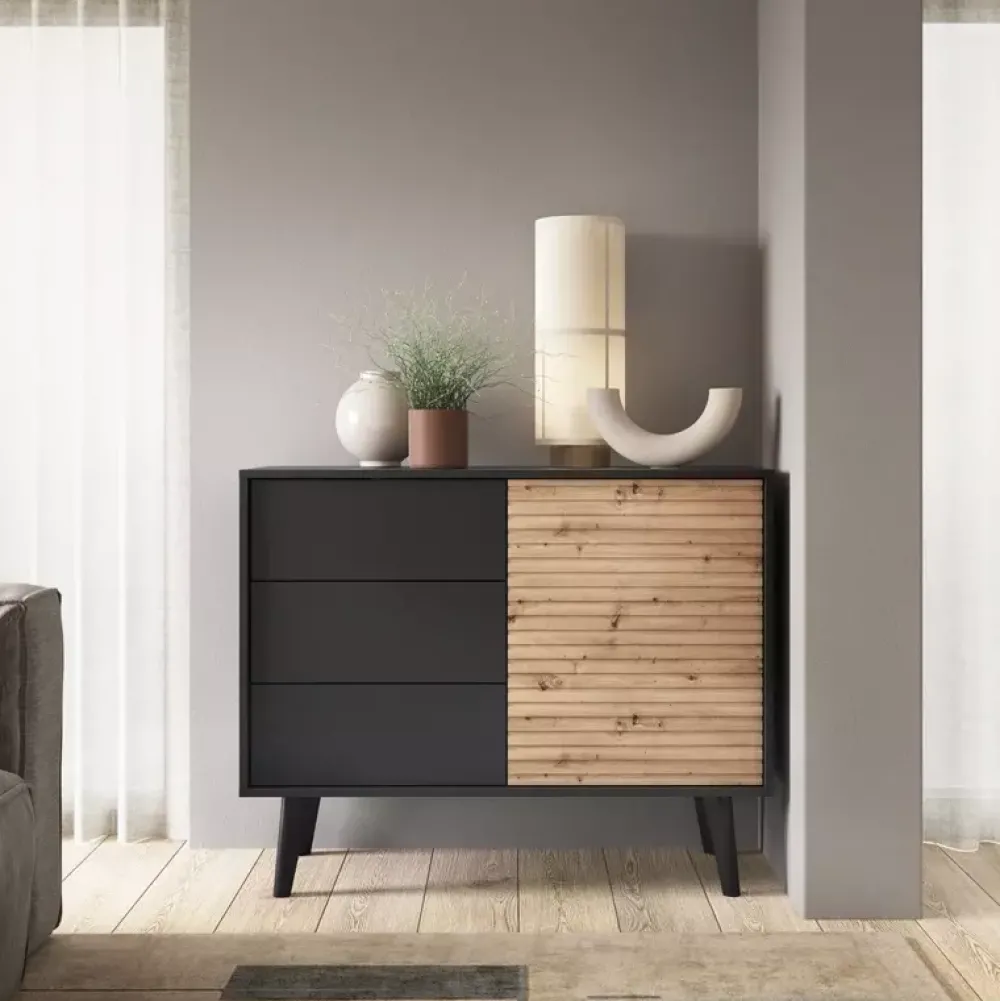 - Nowoczesna komoda VITERBO do salonu w modnej stylistyce z trzema czarnymi szufladami i ryflowanymi drzwiami w kolorze dąb artisan. Komoda posiada czarne drewno-bukowe nogi.