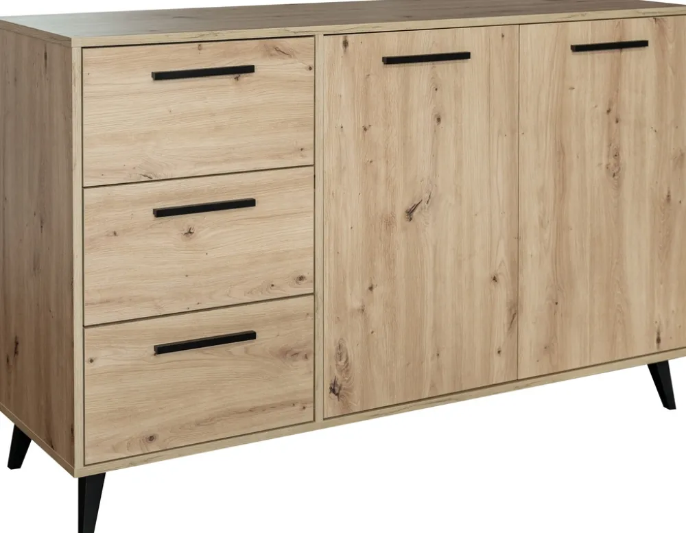 - Dwudrzwiowa komoda 140 cm KODA posiada trzy szuflady osadzone na prowadnicach rolkowych oraz dwie półki za drzwiami. Korpus oraz front komody wykonano z płyty laminowanej 16 mm. Nóżki o wysokości 12 cm pozwalają na łatwe odkurzanie.