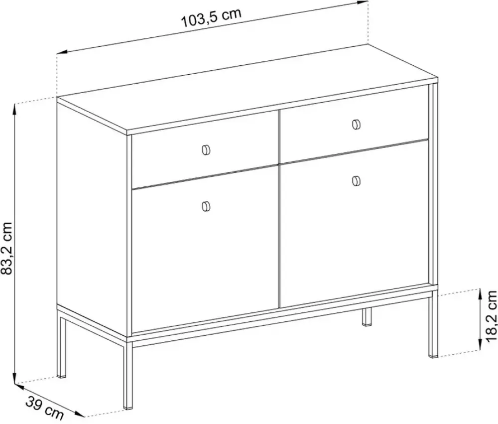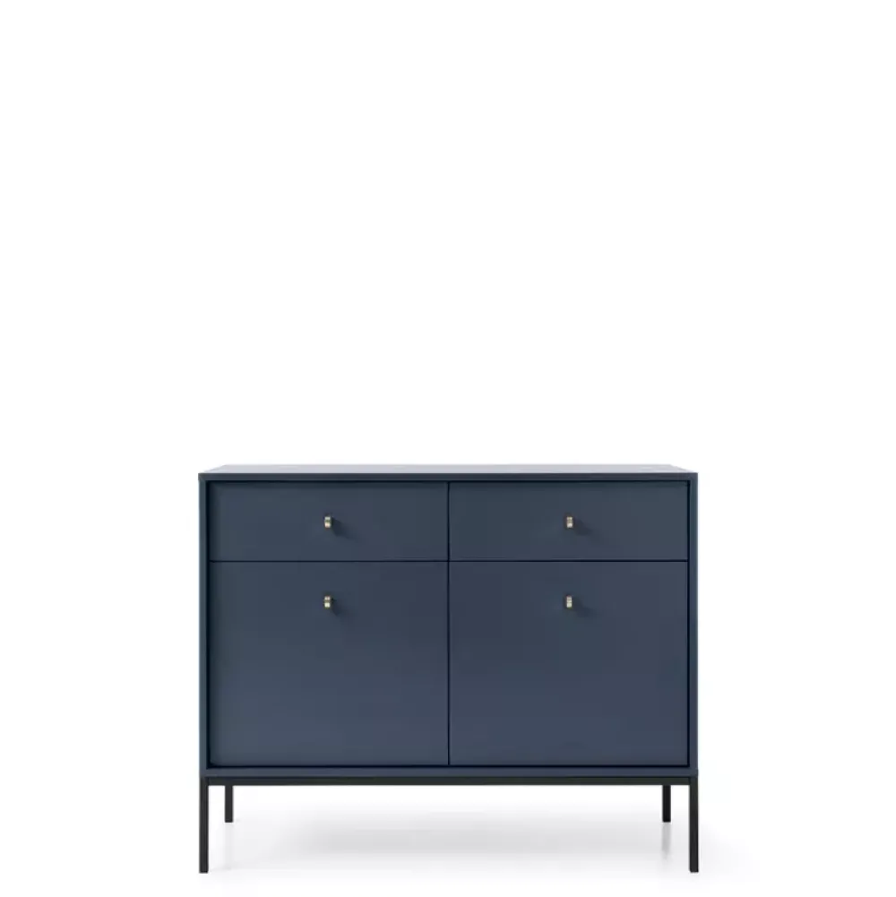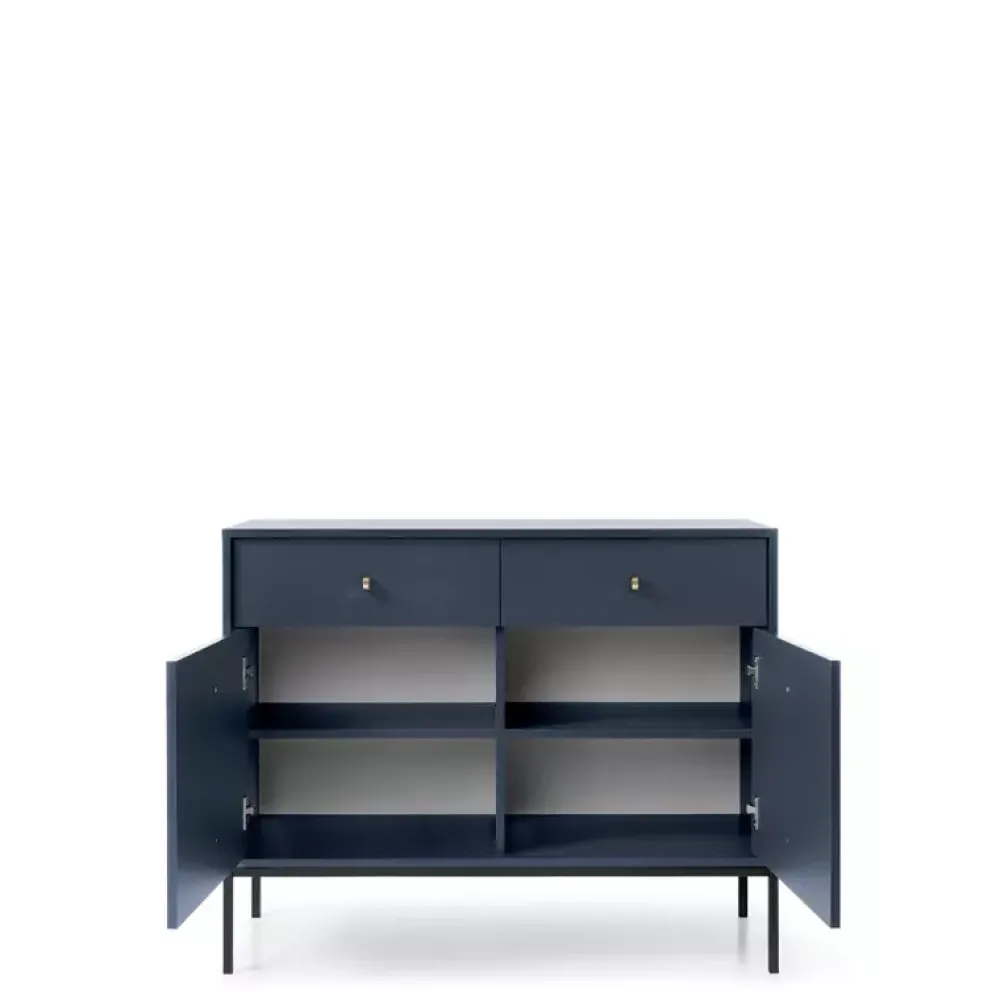 - Ta nowoczesna komoda MONTI w granatowym kolorze na czarnych metalowych nogach to idealny dodatek do Twojego salonu. Z dwoma drzwiami i dwiema szufladami oferuje mnóstwo miejsca na przechowywanie. Funkcjonalność i styl w jednym.