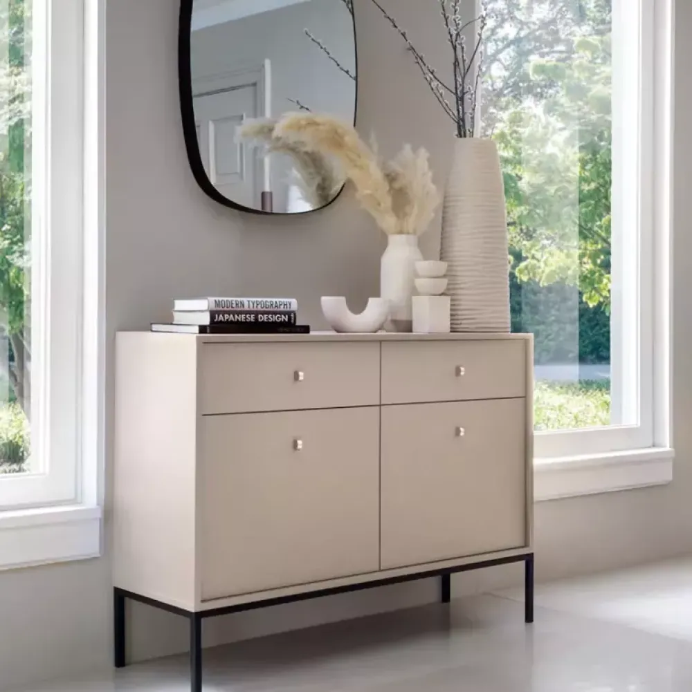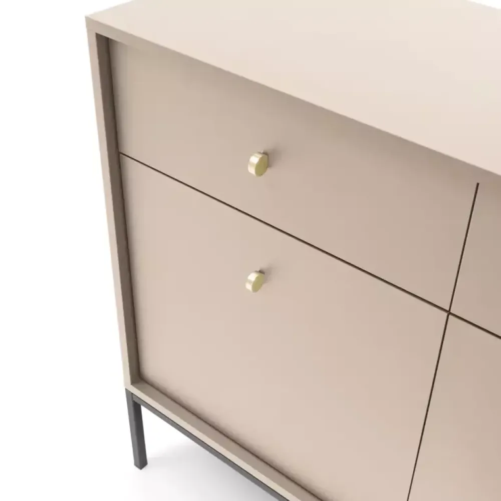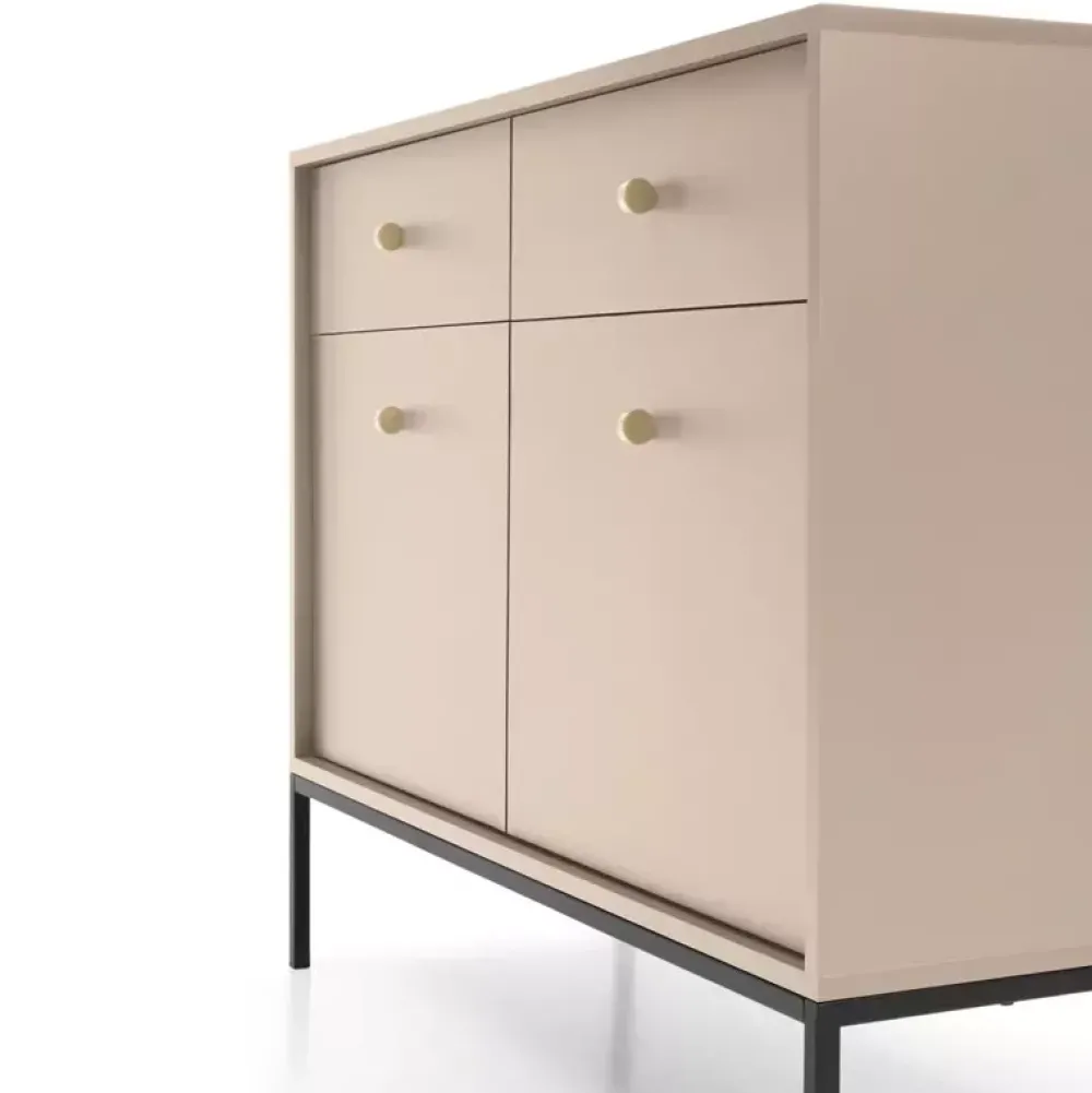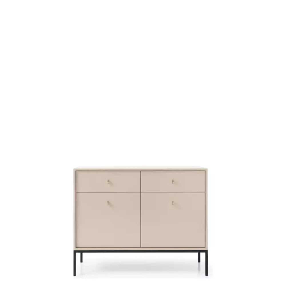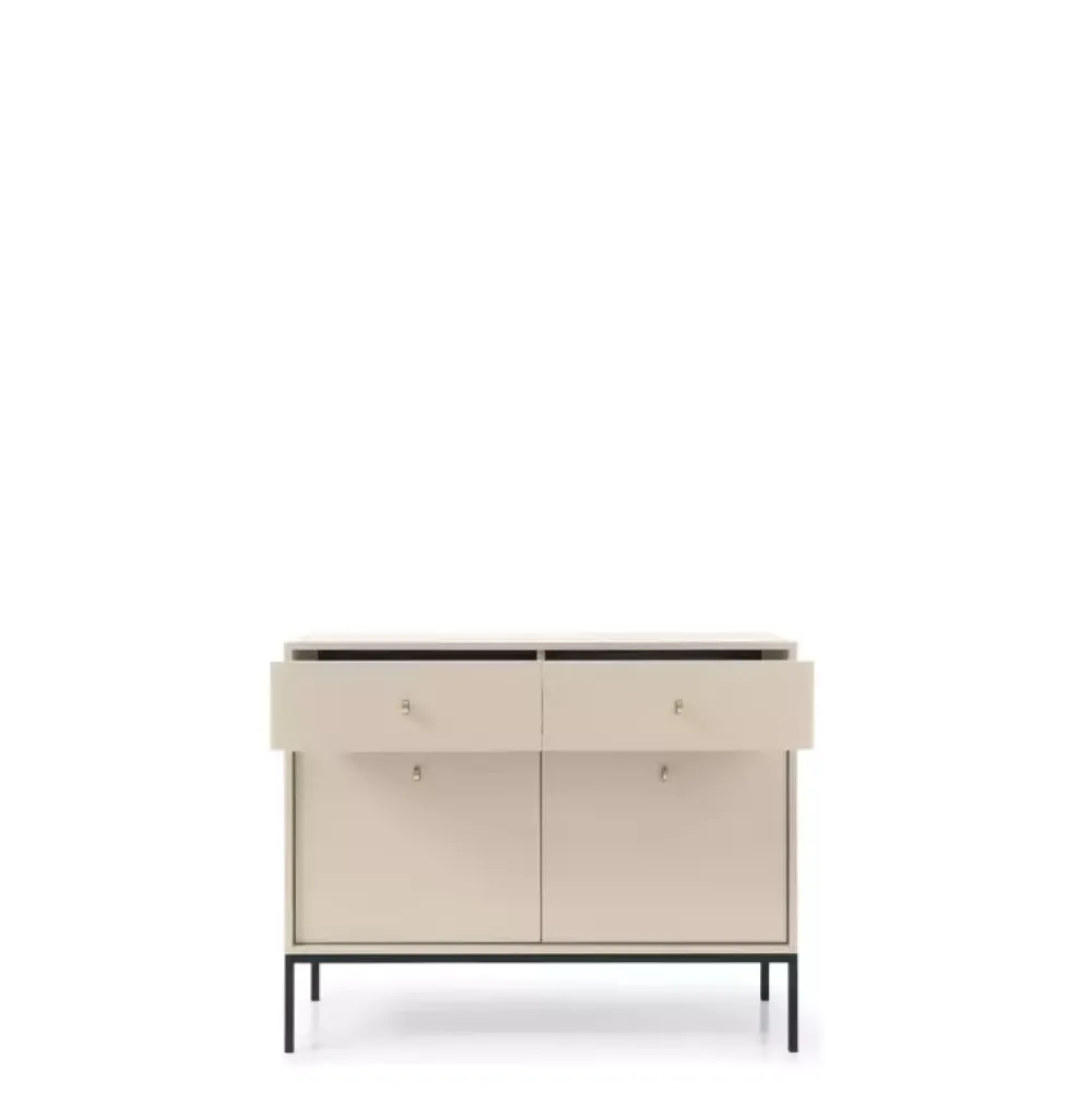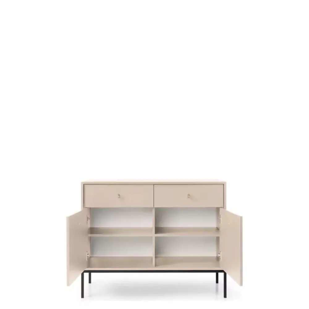 - Ta nowoczesna komoda MONTI w beżowym kolorze na czarnych metalowych nogach to idealny dodatek do Twojego salonu. Z dwoma drzwiami i dwiema szufladami oferuje mnóstwo miejsca na przechowywanie. Funkcjonalność i styl w jednym.