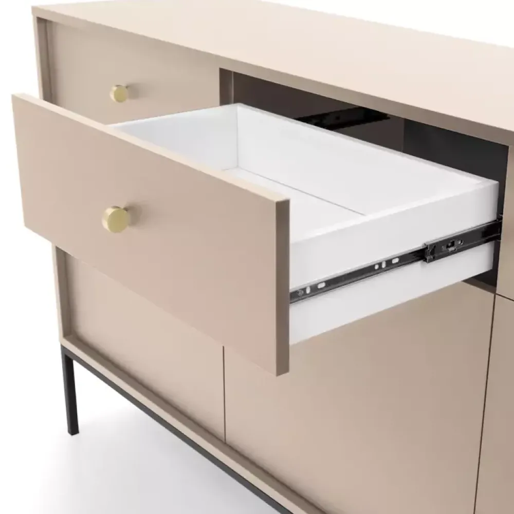 Nogi komody są wykonane z czarnego i metalowego materiału, co nadaje jej stabilność i solidność. Dodatkowo złote i metalowe uchwyty są eleganckim akcentem, który wprowadza subtelny kontrast do beżowego koloru komody.