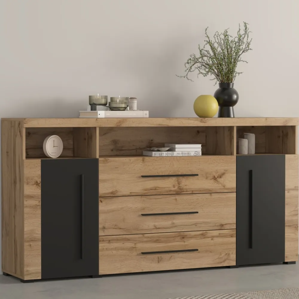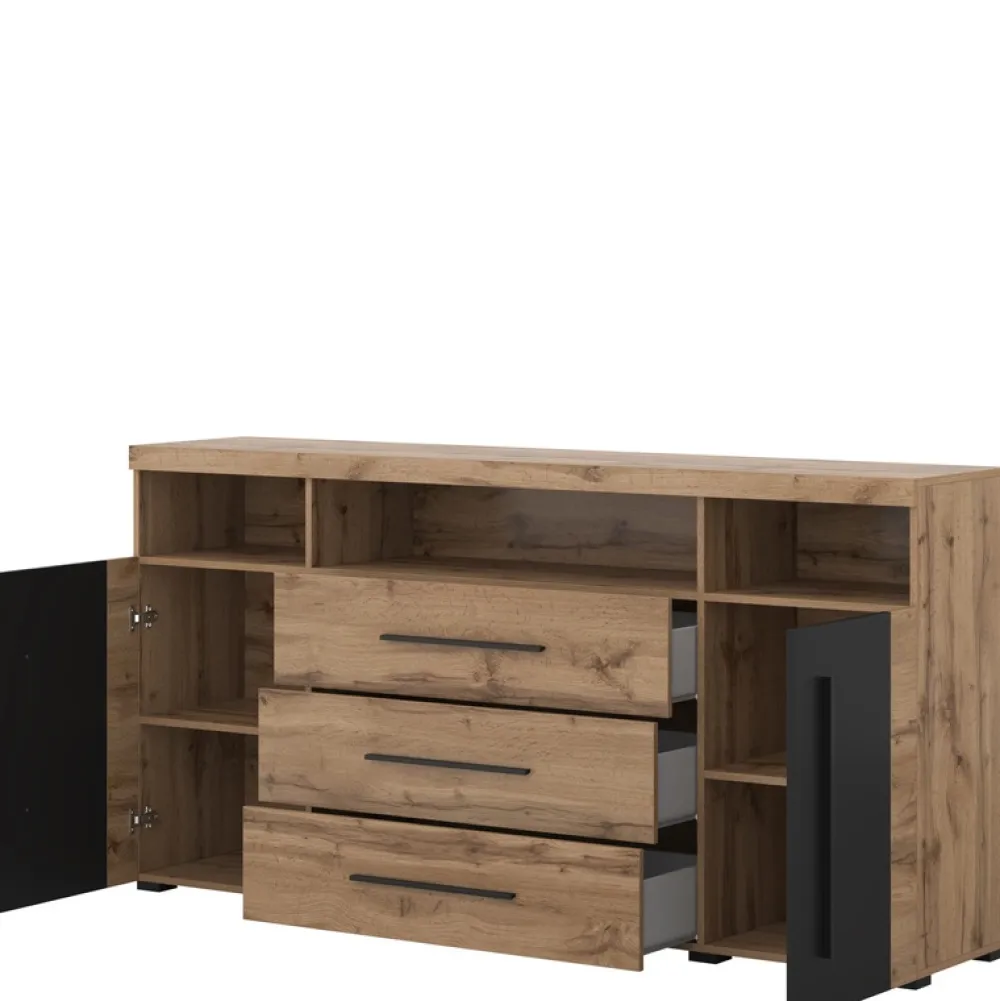 Komoda do salonu ROGER to połączenie nowoczesnego stylu z praktycznymi rozwiązaniami do codziennego użytku. Jej naturalne wykończenie w odcieniu dębu oraz kontrastujące czarne detale tworzą harmonijną całość, która doskonale wkomponuje się zarówno w przestrzeń nowoczesną, jak i loftową. ROGER to idealny wybór dla osób ceniących estetykę oraz przemyślane przechowywanie.