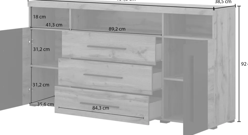 Zastanawiasz się, czy komoda z szufladami i półkami zmieści się w mniejszym pomieszczeniu? Dzięki swojej kompaktowej głębokości 39 cm i szerokości 183 cm, ROGER doskonale odnajdzie się również w węższych przestrzeniach, oferując maksymalną pojemność przy minimalnym zajęciu miejsca.