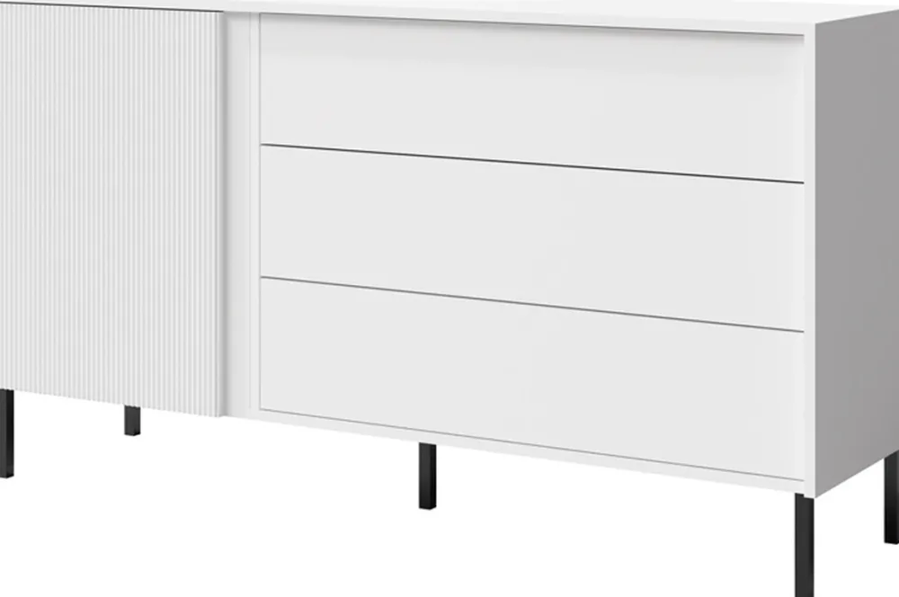 Front komody ozdobiony lamelami wykonany jest z solidnej płyty MDF, co gwarantuje nie tylko wysoką trwałość, ale także nowoczesny wygląd. Za drzwiami komody znajdziesz dwie przestronne półki, które umożliwiają wygodne przechowywanie różnych przedmiotów. Dodatkowo komoda wyposażona jest w trzy pojemne szuflady, poruszające się na prowadnicach kulkowych, co zapewnia ich płynne i ciche działanie.