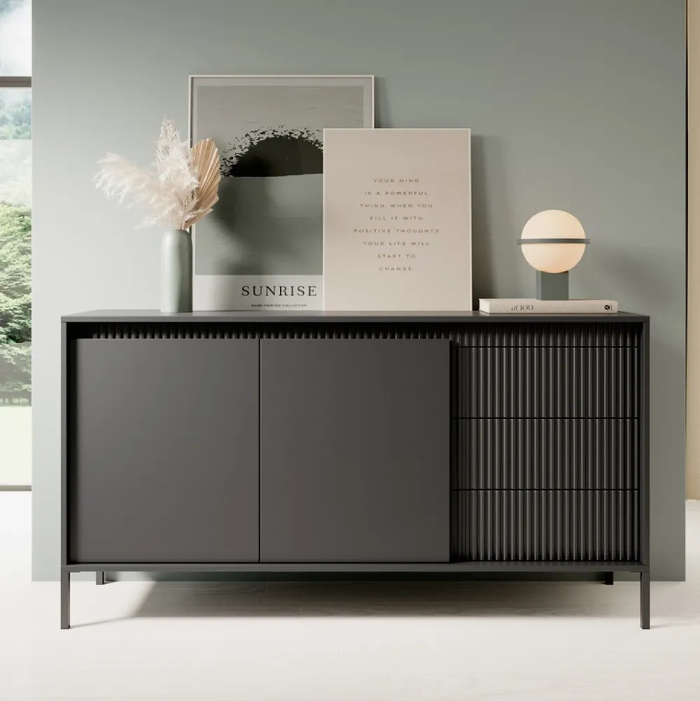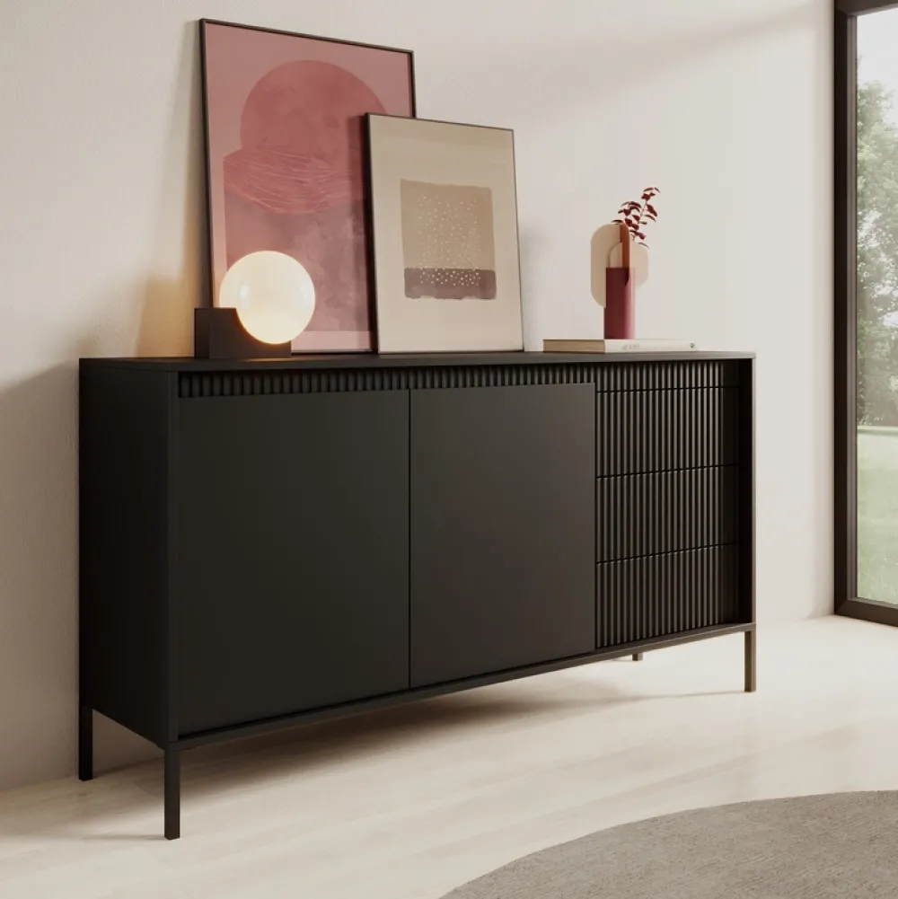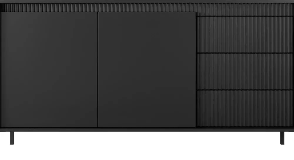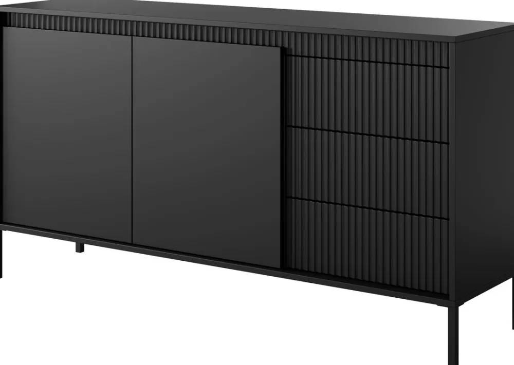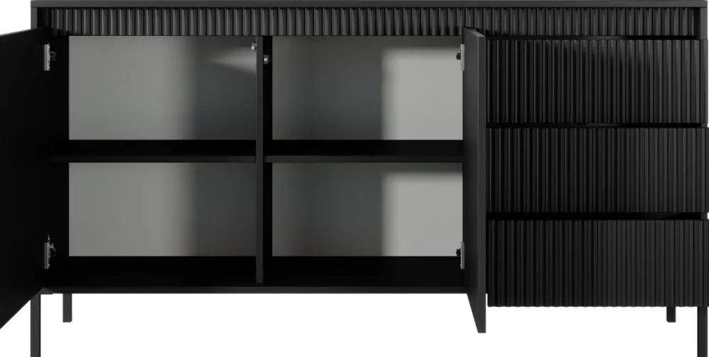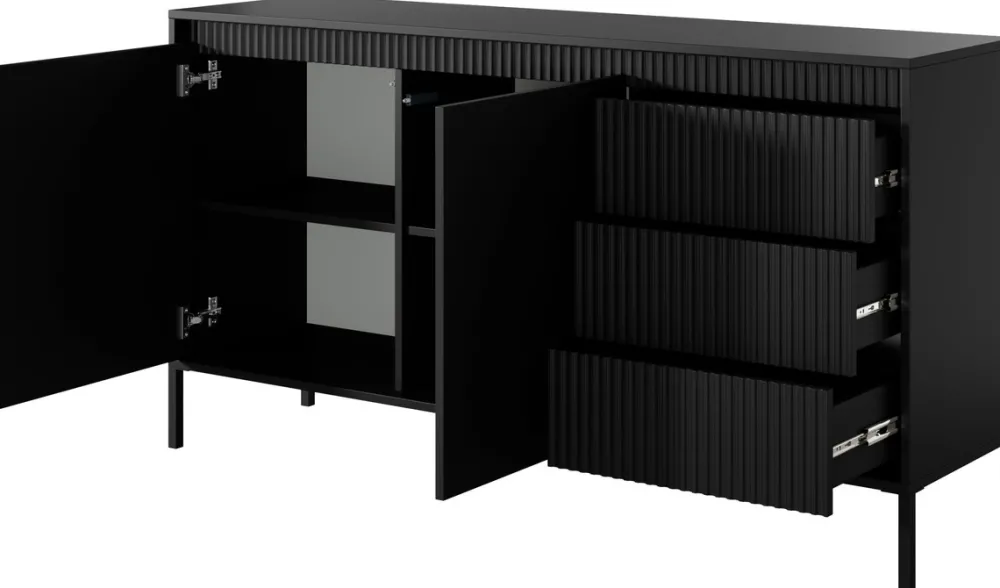 Komoda o szerokości 153 cm to idealne rozwiązanie dla osób ceniących elegancki design i funkcjonalność. Po lewej stronie znajdują się dwoje drzwi, za którymi ukryto cztery pojemne półki, natomiast prawa strona to trzy praktyczne szuflady, które ułatwią organizację drobniejszych przedmiotów. Frezowane fronty z płyty MDF wprowadzają do wnętrza stylowy akcent, a wysokie metalowe nóżki dodają lekkości i nowoczesnego wyglądu.