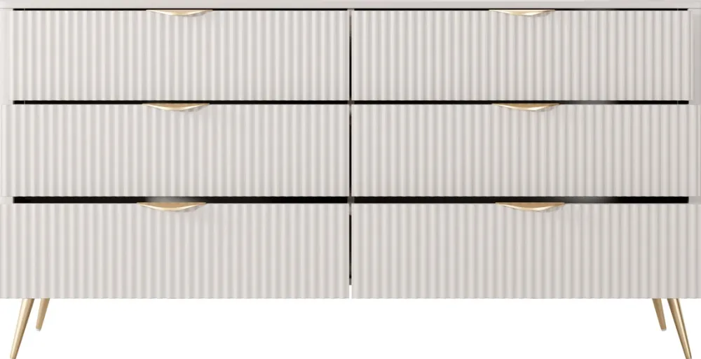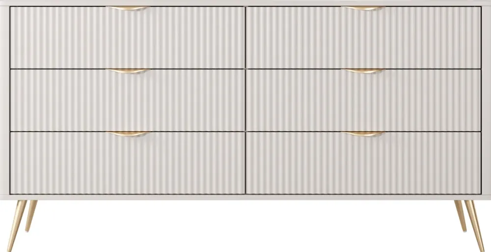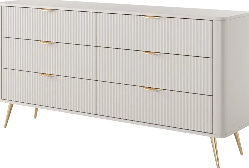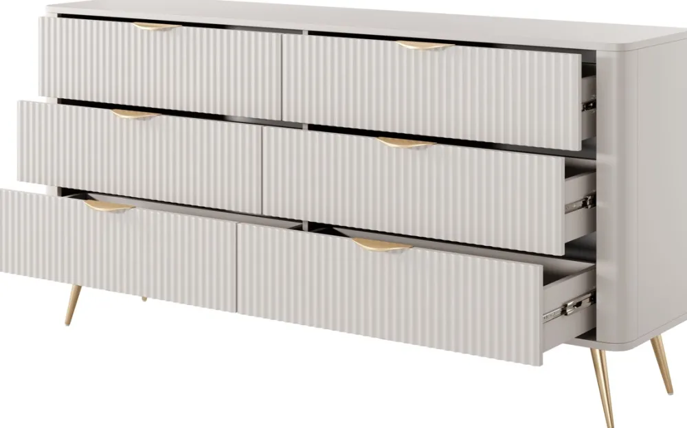 - Komoda LEONTE 163 cm w kolorze kaszmir z beżowymi frontami, 6 szufladami i złotymi uchwytami. Idealna do sypialni – elegancka, pojemna i trwała. MDF, pełen wysuw i zaokrąglone detale tworzą harmonijny styl z funkcjonalnością.