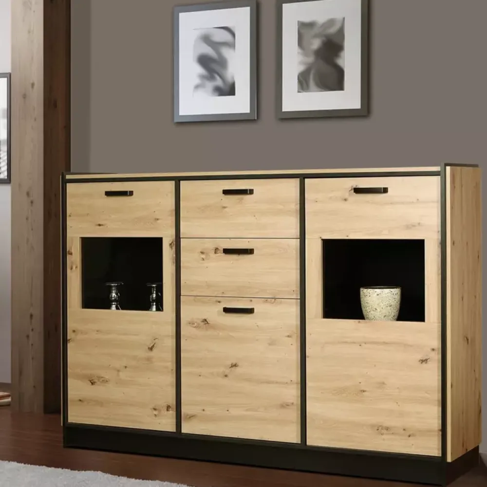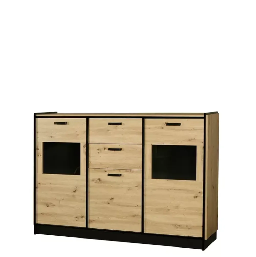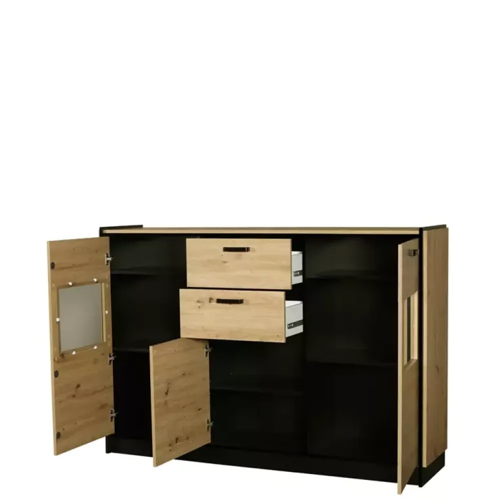 Komoda do salonu KALETTO to idealny wybór dla każdego, kto szuka stylowego, a jednocześnie funkcjonalnego mebla. Zaprojektowana w nowoczesnej stylistyce, komoda z szufladami pasuje doskonale do nowoczesnych wnętrz. Przeszklone drzwi oraz dwie szuflady w centralnej części umożliwiają łatwe przechowywanie różnych przedmiotów i zapewniają niezbędną przestrzeń do przechowywania. Obrzeża zabezpieczone okleiną PCV sprawiają, że komoda jest trwała i wytrzymała na długie lata użytkowania. Dodatkowo, metalowe uchwyty nadają meblowi elegancki wygląd, a jednocześnie zapewniają wygodne otwieranie i zamykanie szuflad i drzwi. Wybierając tę nowoczesną komodę do salonu, otrzymujesz mebel, który nie tylko będzie pasować do Twojego wnętrza, ale także zapewni wiele korzyści. Dzięki szufladom i drzwiom, masz dostęp do niezbędnej przestrzeni do przechowywania, co umożliwia utrzymanie porządku w salonie. Obrzeża zabezpieczone okleiną PCV oraz metalowe uchwyty zapewniają trwałość i wygodę użytkowania. To wszystko sprawia, że ta komoda to idealne rozwiązanie dla Twojego salonu.