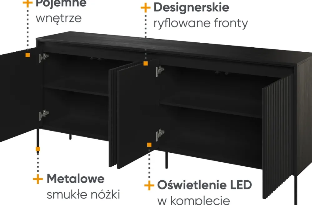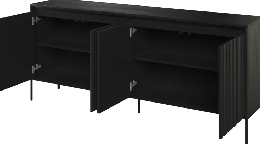 Ta czterodrzwiowa komoda do salonu z frezowanymi frontami to więcej niż mebel – to artystyczne i funkcjonalne wyrażenie Twojego stylu. Jej zmysłowe linie i elegancki, czarny kolor sprawią, że stanie się ona niezapomnianym elementem Twojego salonu.