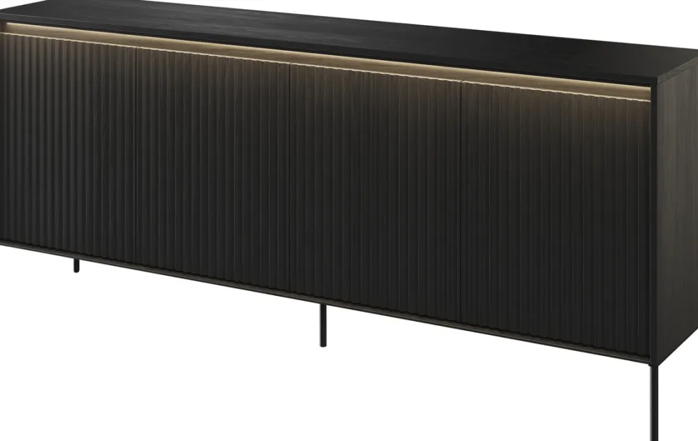 Komoda wyposażona jest w energooszczędne oświetlenie LED klasy A++, które dodaje do wnętrza przytulnego klimatu. Światło subtelnie podkreśla wyjątkowy czarny kolor komody, tworząc jednocześnie przytulną atmosferę.