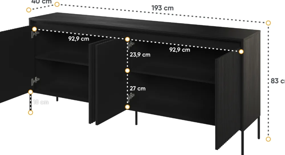 Precyzyjnie ryflowane fronty z prostym frezowaniem, dodają meblowi głębi i wyjątkowego charakteru. Wykonane z płyty MDF o grubości 18 mm, pokryte są niezwykle eleganckim czarnym kolorem, który dodaje wnętrzu powagi i wyrafinowania.