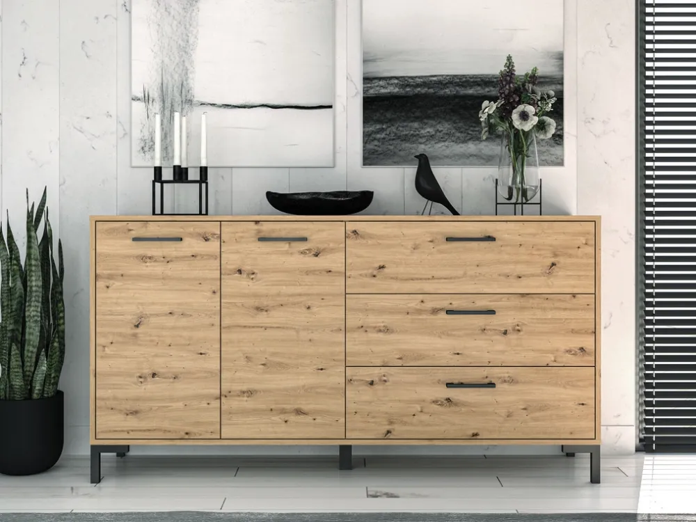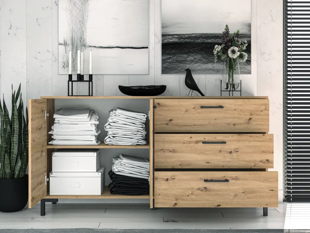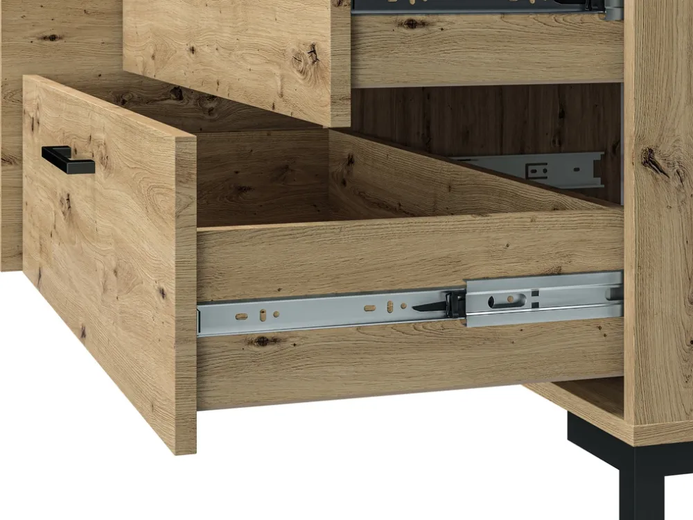 Komoda wyposażona jest w trzy praktyczne szuflady, które poruszają się na prowadnicach kulkowych, gwarantując płynne i ciche otwieranie oraz zamykanie. Dodatkowo szuflady oferują dużo miejsca do przechowywania, pomagając utrzymać porządek w Twoim salonie.