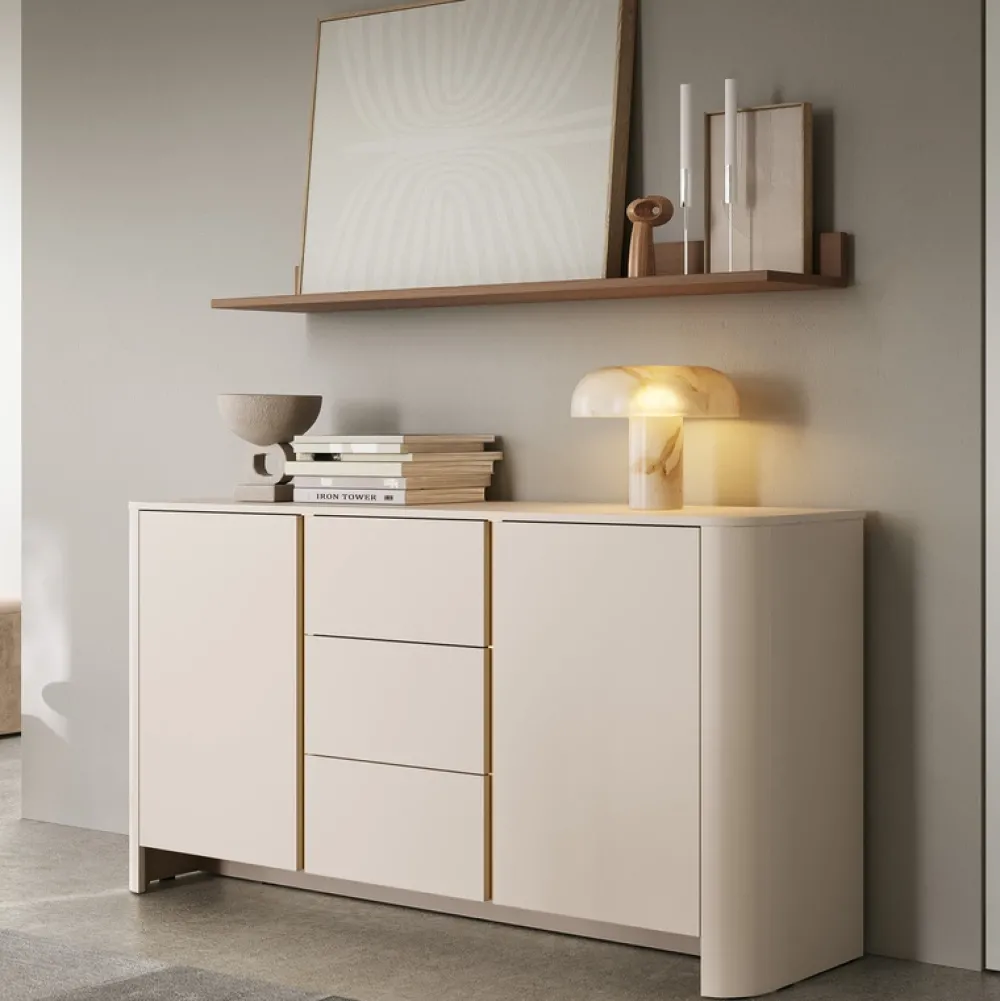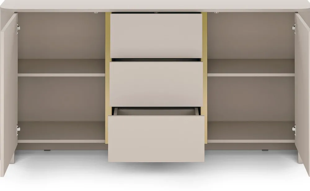 Komoda BELVI to mebel, który łączy nowoczesną estetykę z dużą funkcjonalnością. Brak widocznych uchwytów nadaje całości lekkości, a złote detale podkreślają jej wyjątkowy charakter. Idealna do wnętrz, w których liczy się porządek, styl i wygoda użytkowania.