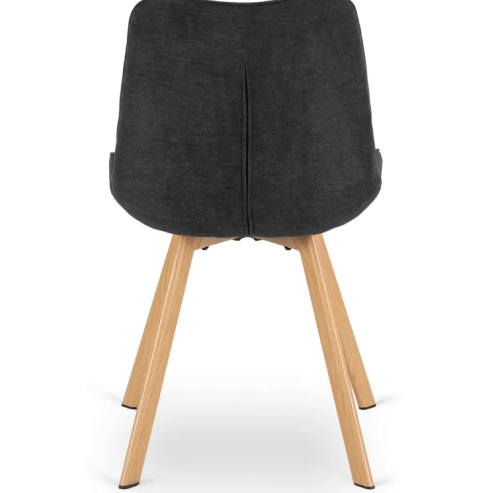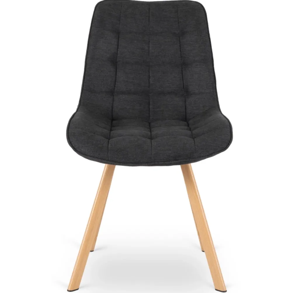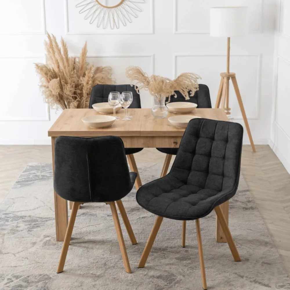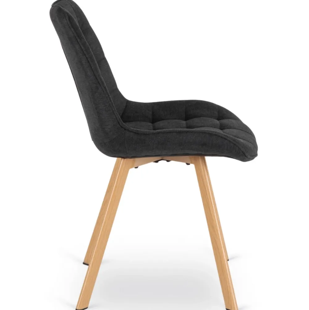 - Krzesło tapicerowane KAMIA w kolorze czarnym to idealne połączenie elegancji i komfortu. Pikowane siedzisko i ergonomiczne oparcie zapewniają wygodę, a metalowe nogi w kolorze dębu wprowadzają naturalny akcent. Idealne do jadalni, biura.