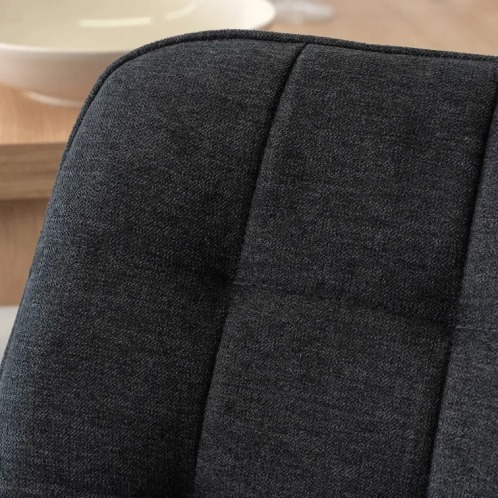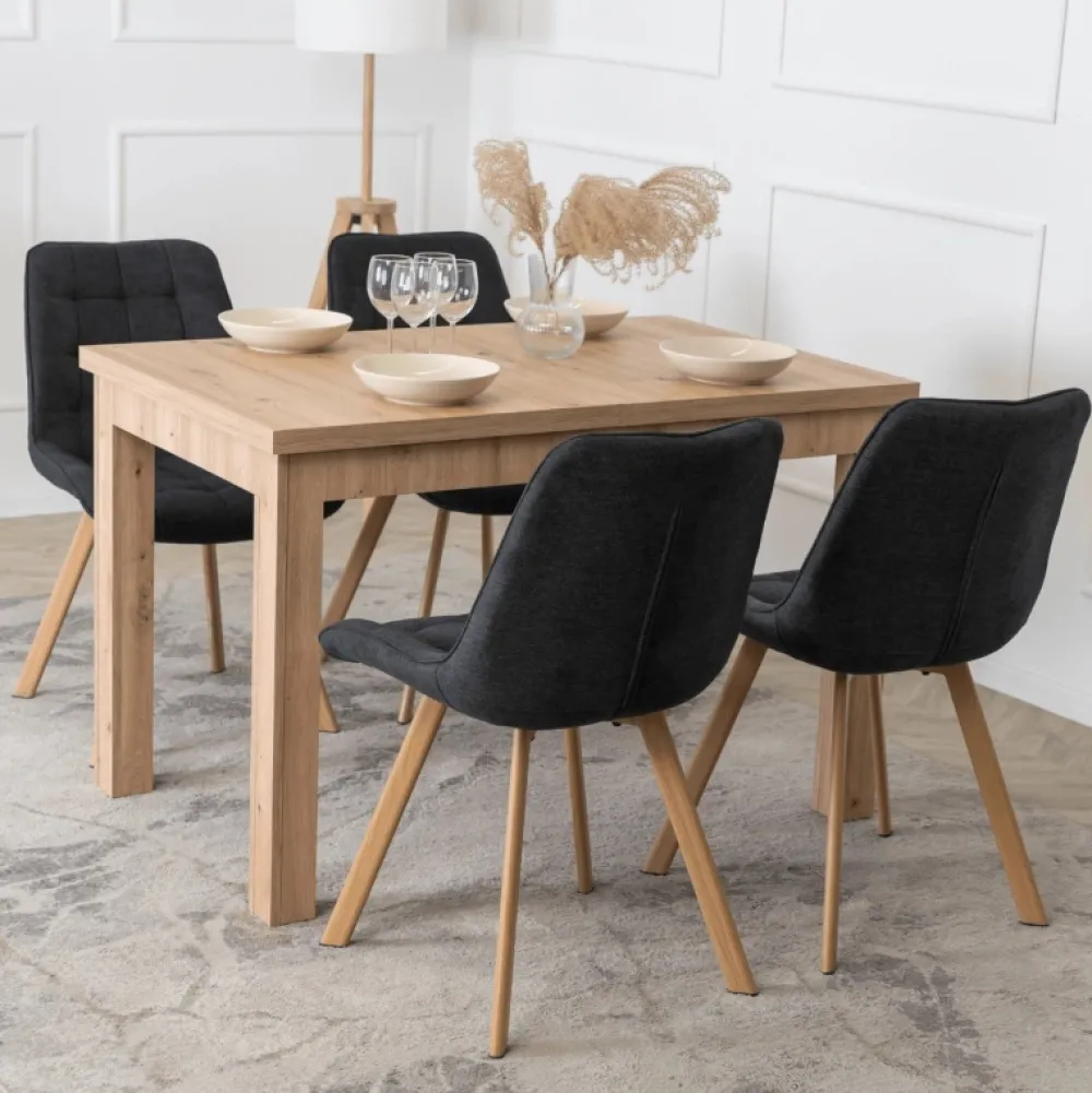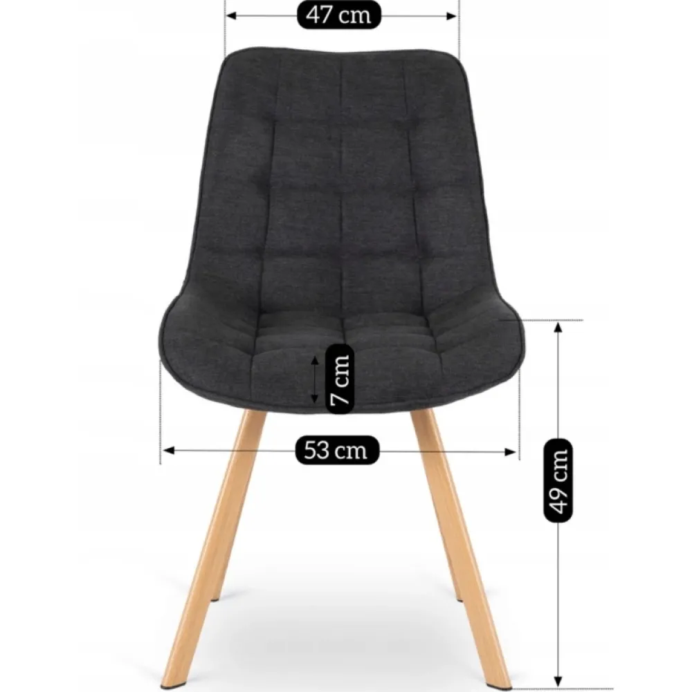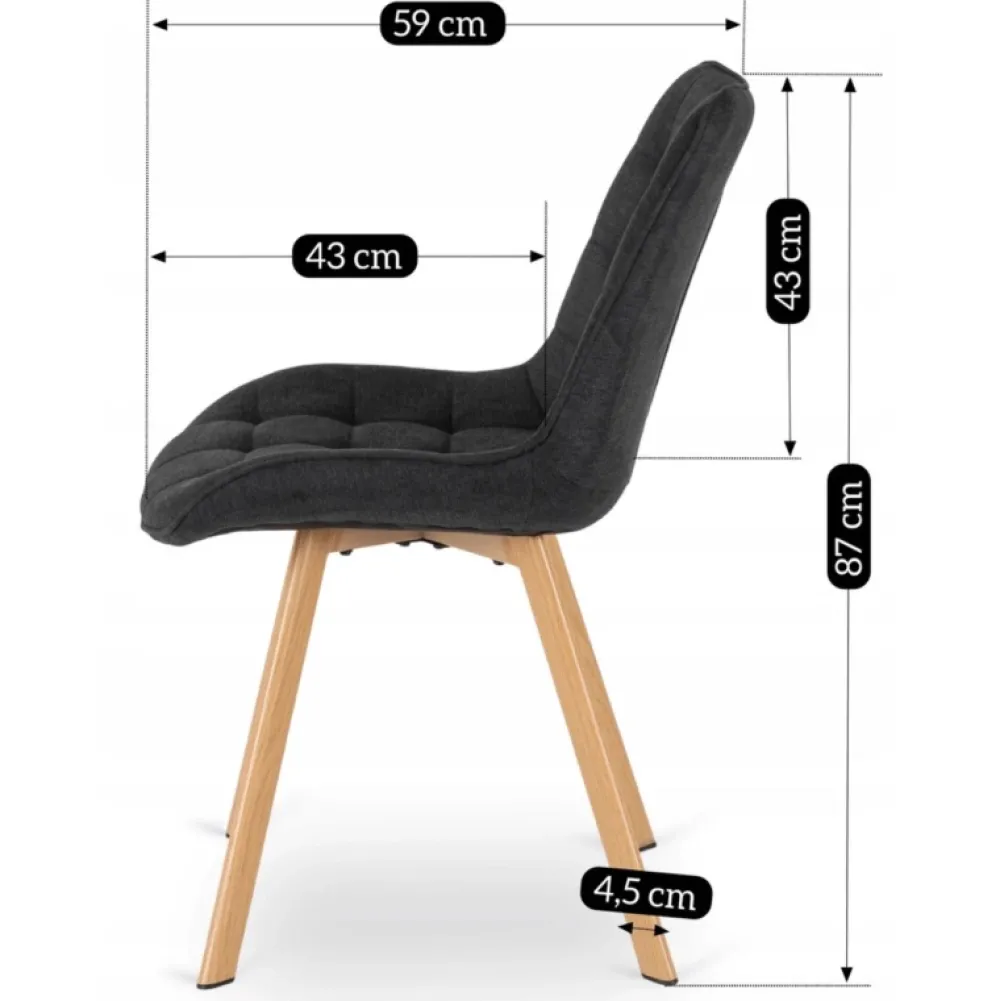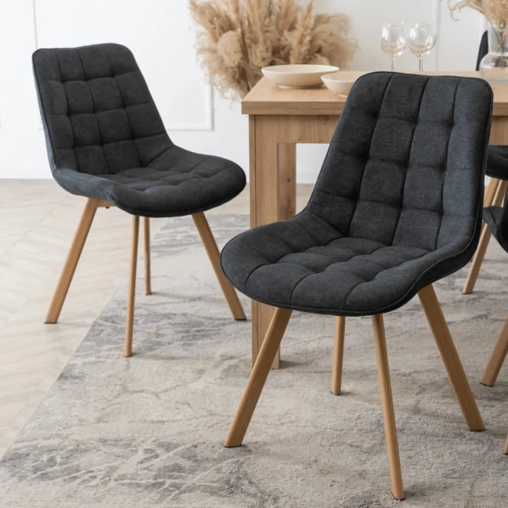- Krzesło tapicerowane KAMIA w kolorze czarnym to idealne połączenie elegancji i komfortu. Pikowane siedzisko i ergonomiczne oparcie zapewniają wygodę, a metalowe nogi w kolorze dębu wprowadzają naturalny akcent. Idealne do jadalni, biura.