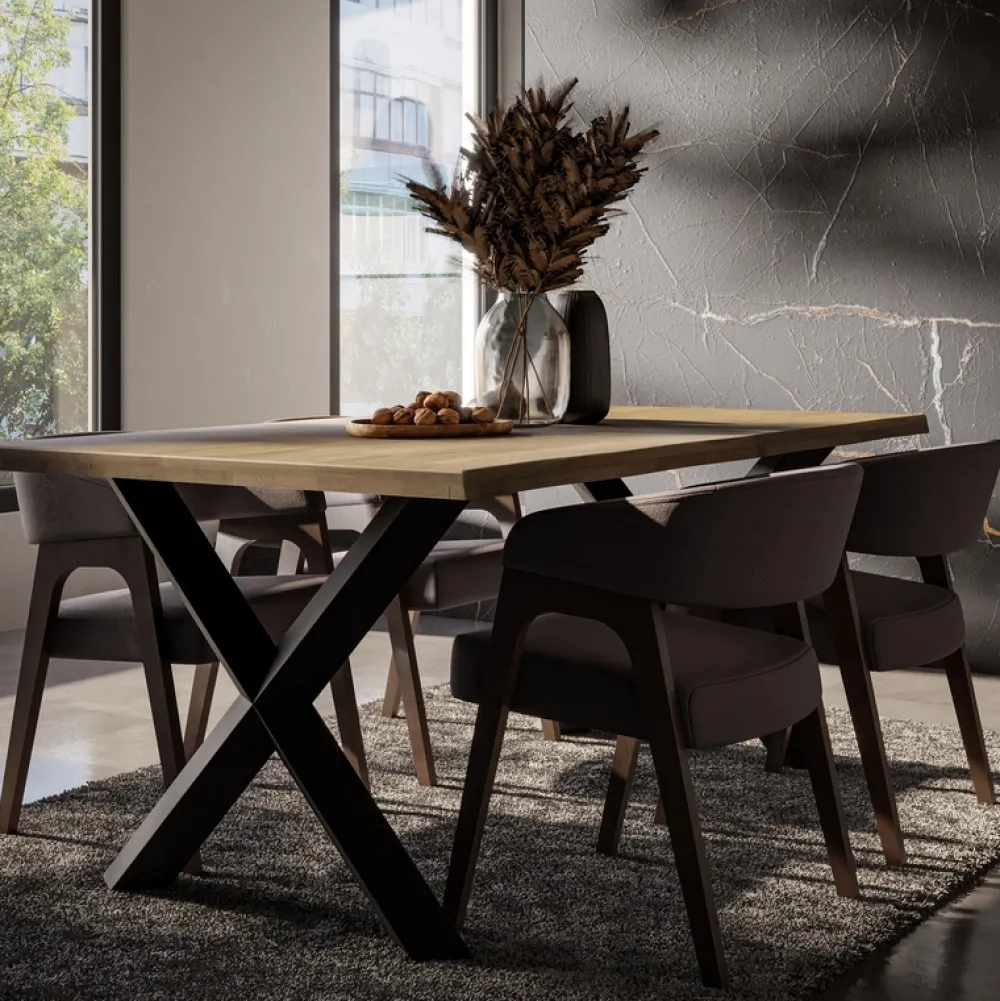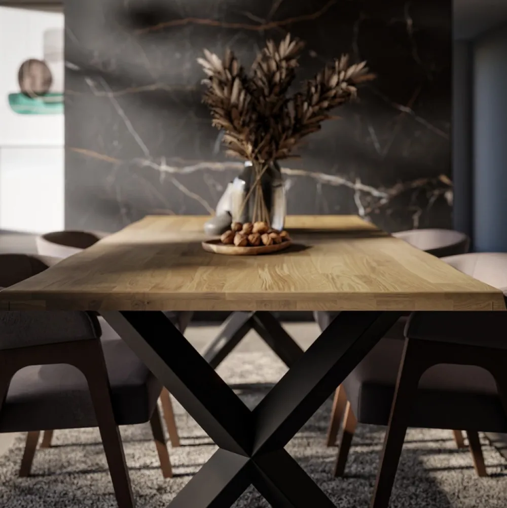 Stół loftowy z litego drewna MERLIVO to kwintesencja ponadczasowego designu, który łączy surowość metalu z ciepłem naturalnego dębu. Idealny do jadalni, kuchni lub salonu w stylu industrialnym, nowoczesnym czy minimalistycznym. Blat z olejowanego drewna dębowego emanuje naturalnym urokiem, a solidne metalowe nogi w formie litery X dodają mu charakteru i stabilności. Naturalnie nieregularne krawędzie blatu podkreślają jego autentyczność i organiczną formę – to stół, który nie udaje natury, tylko nią jest.