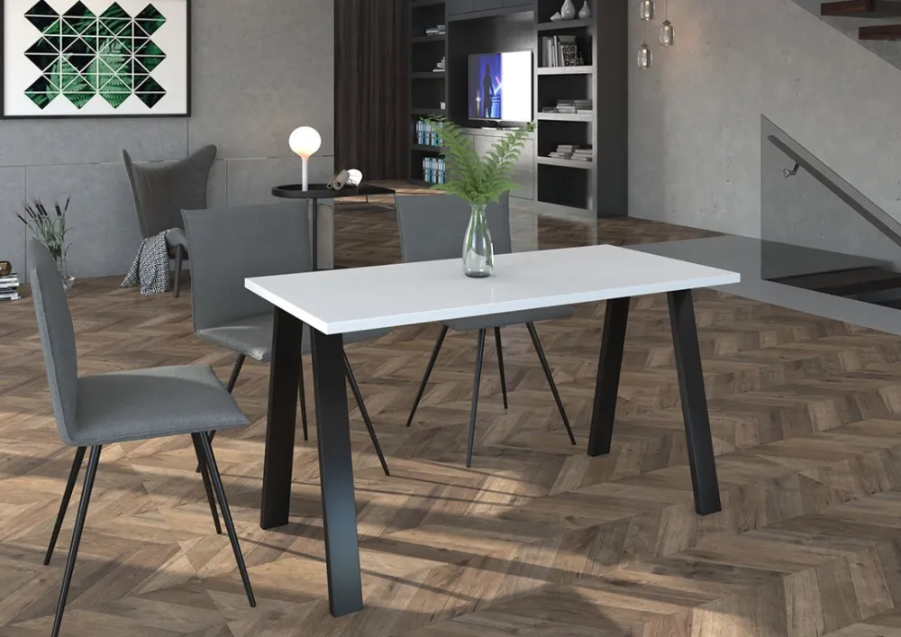Solidne stoły na metalowych nogach z drewnopodobnymi blatami wykonanymi z płyty laminowanej grubości 28 mm. Stoły do salonu, jadalni lub kuchni dostępne są w kilku rozmiarach i kolorach. Stół z metalowymi nogami to solidny i niezwykle stabilny mebel, z którego samodzielnym montażem nikt nie powinien mieć większych problemów. Zastosowanie metalowych, skośnych, ale atrakcyjnie prezentujących się nóg, nadaje całości konstrukcji niezwykle nowoczesny wygląd.