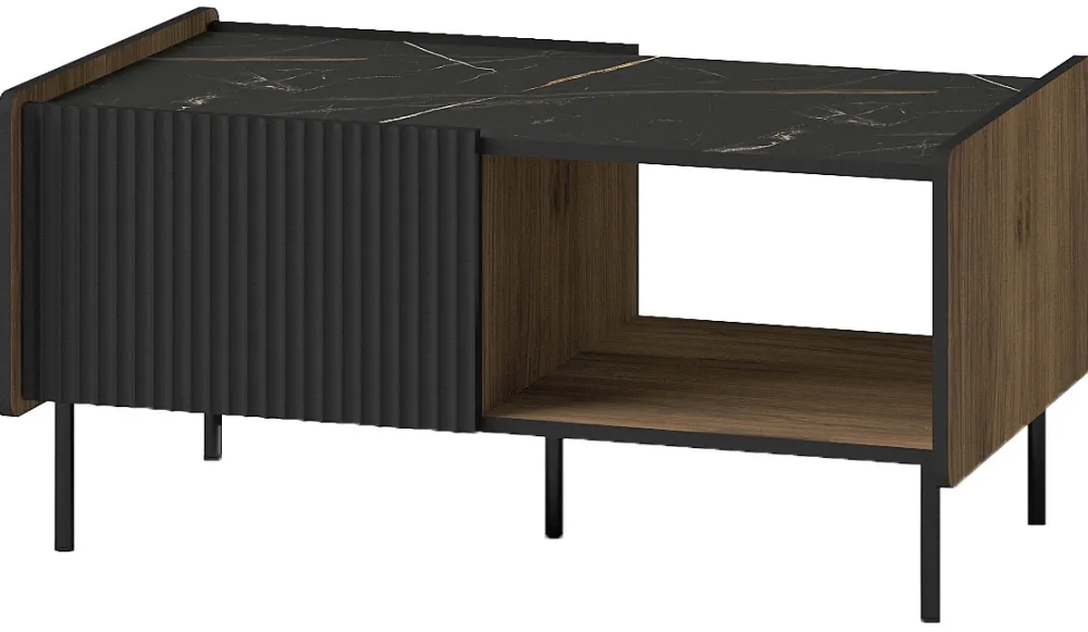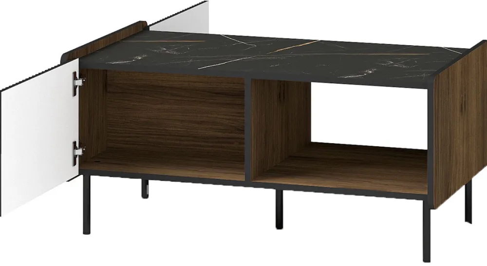 Kolorystyka stolika to mistrzowskie połączenie ciepłych tonów orzecha warmia na korpusie, eleganckiego, ryflowanego frontu szafki w głębokiej czerni, a także subtelnego blatu w odcieniu san sebastian, który dodaje całości lekkości i nowoczesności. Ta harmonijna paleta barw, łącząca w sobie różnorodne tekstury i odcienie, nadaje meblowi wyjątkowego charakteru, który łatwo dopasuje się do różnorodnych aranżacji wnętrz, dodając im wyrafinowanego uroku.