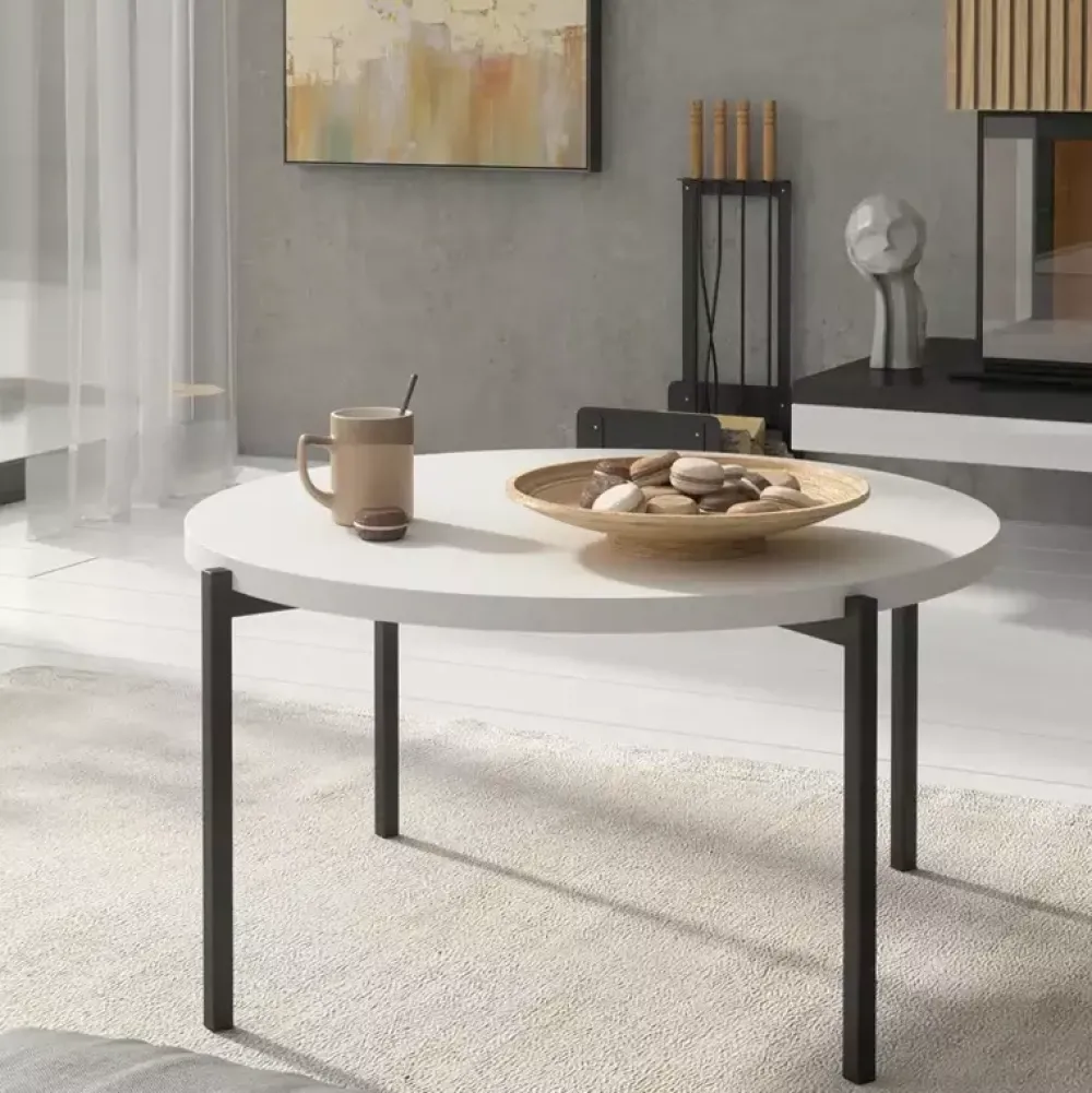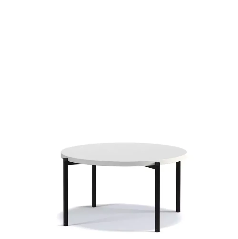 Okrągły stolik kawowy z kolekcji ETA ma biały blat wykonany z wysokiej jakości płyty laminowanej grubości 32 mm o wykończeniu matowym. Ława do salonu osadzona jest na czarnych metalowych nogach wykonanych z profilu o grubości 20 mm. Stolik jest lekki, więc bez problemu go przestawisz, dzięki czemu świetnie sprawdzi się w małym mieszkaniu. Stelaż delikatnie nachodzi na blat co prezentuje się ciekawie i nowocześnie.