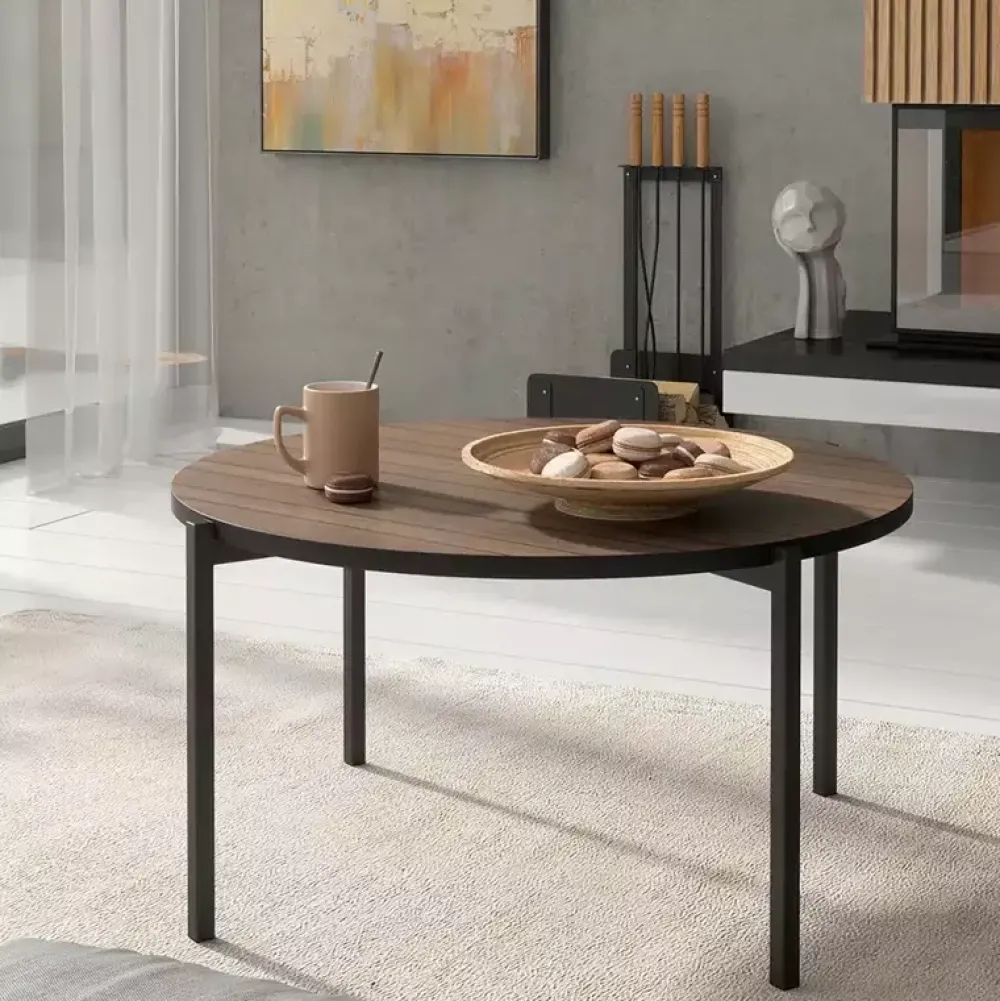- Stolik kawowy na czarnych, metalowych nogach ma solidny okrągły blat wykonany z płyty laminowanej grubości 32 mm.