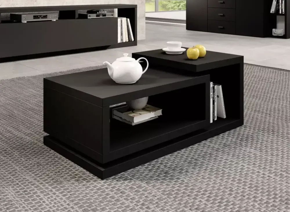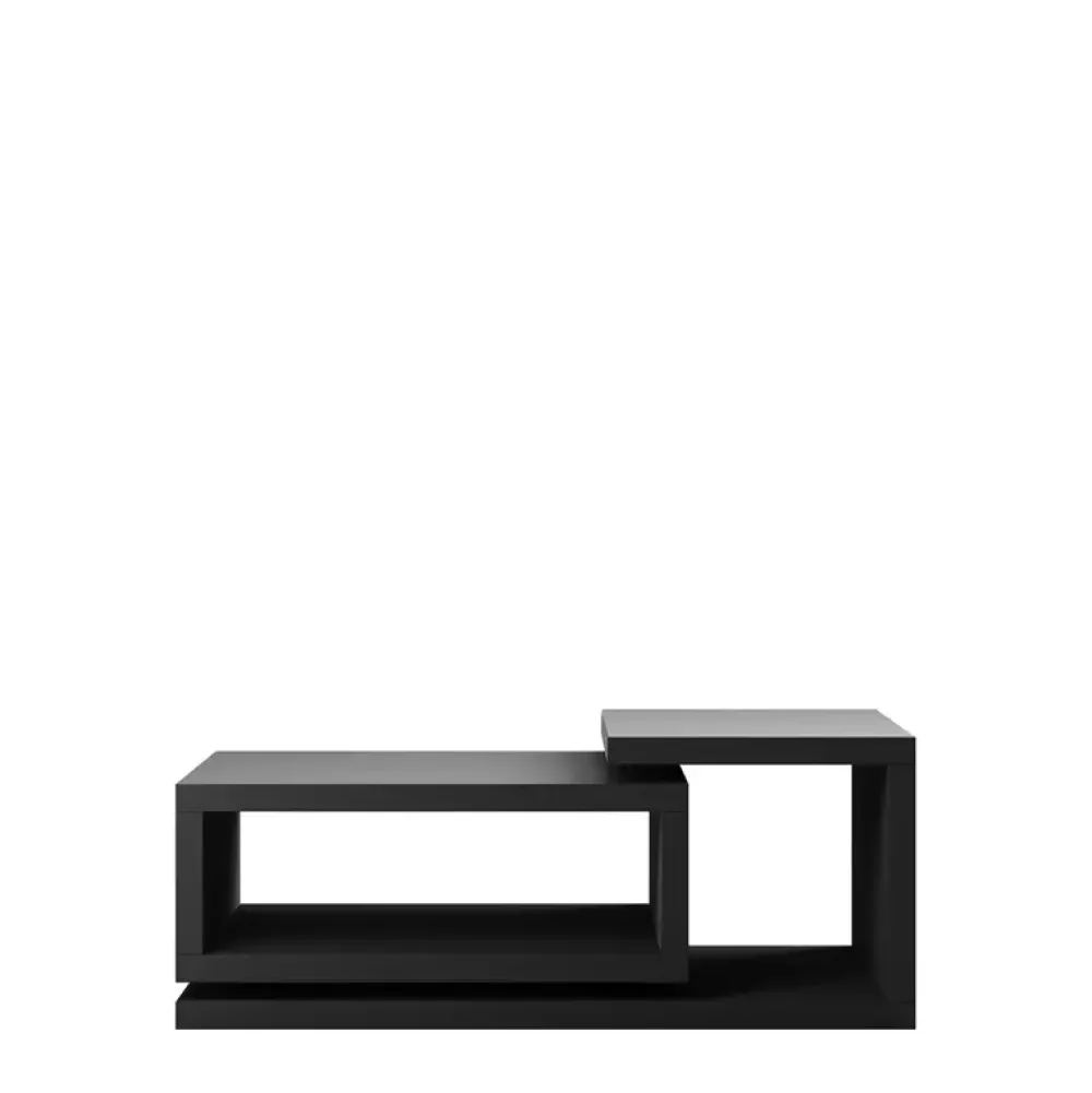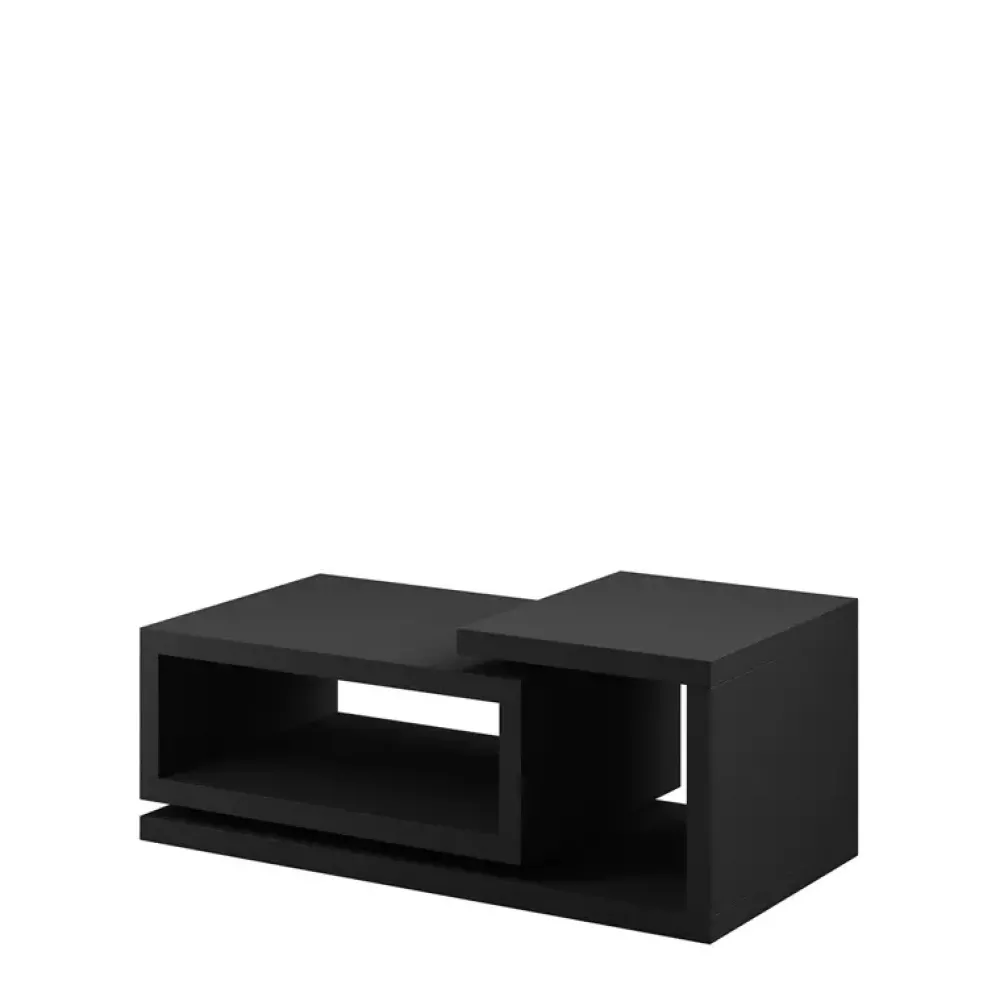 Nowoczesny stolik kawowy dwupoziomowy o asymetrycznym kształcie bryły.